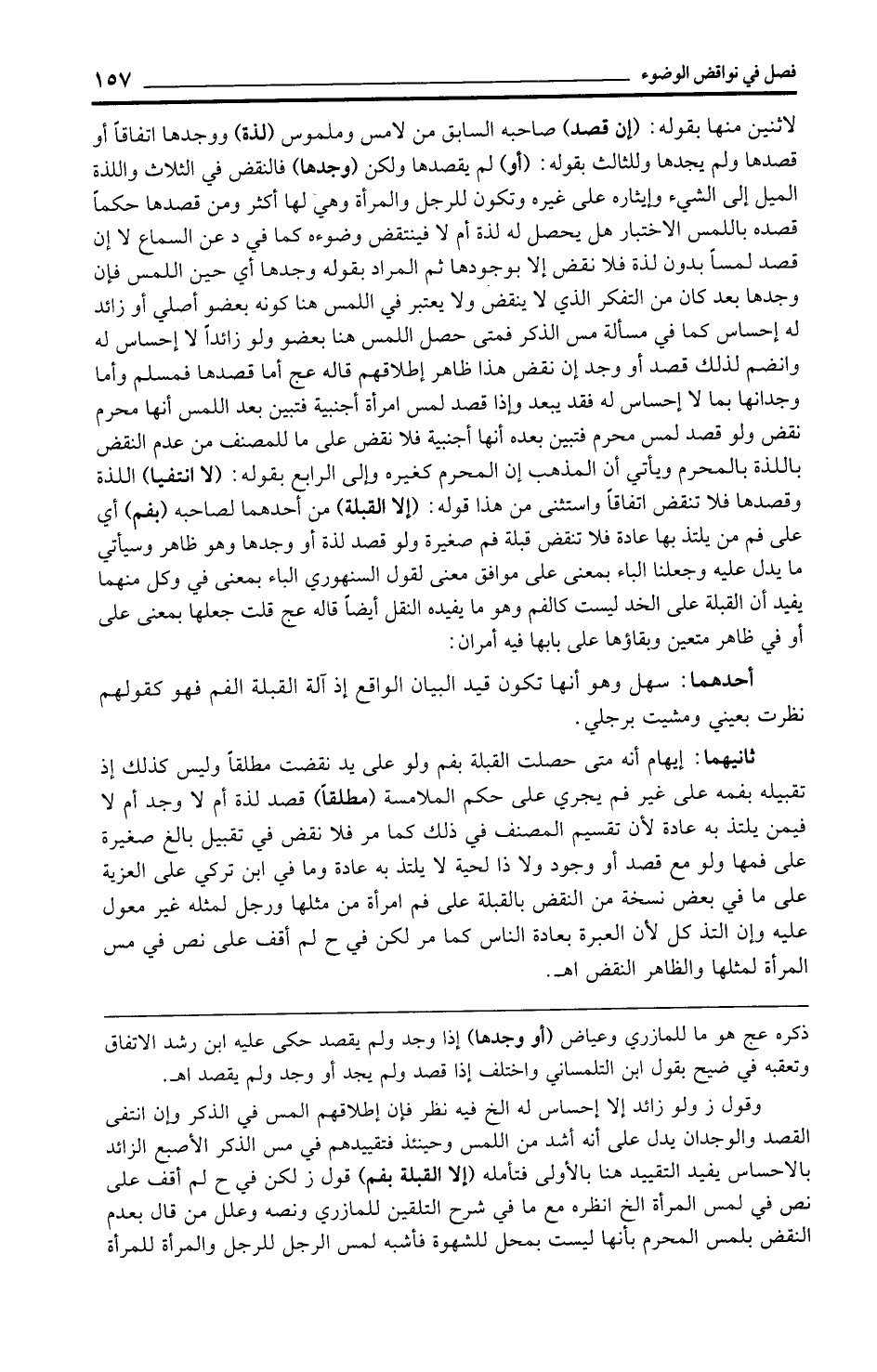 ثانيهما: إيهام أنه متى حصلت القبلة بفم ولو على يد نقضت مطلقًا وليس كذلك إذ تقبيله بفمه على غير فم يجري على حكم الملامسة (مطلقًا) قصد لذة أم لا وجد أم لا فيمن يلتذ به عادة لأن تقسيم المصنف في ذلك كما مر فلا نقض في تقبيل بالغ صغيرة على فمها ولو مع قصد أو وجود ولا ذا لحية لا يلتذ به عادة وما في ابن تركي على العزية على ما في بعض نسخة من النقض بالقبلة على فم امرأة من مثلها ورجل لمثله غير معول عليه وإن التذ كل لأن العبرة بعادة الناس كما مر لكن في ح لم أقف على نص في مس المرأة لمثلها والظاهر النقض اهـ.