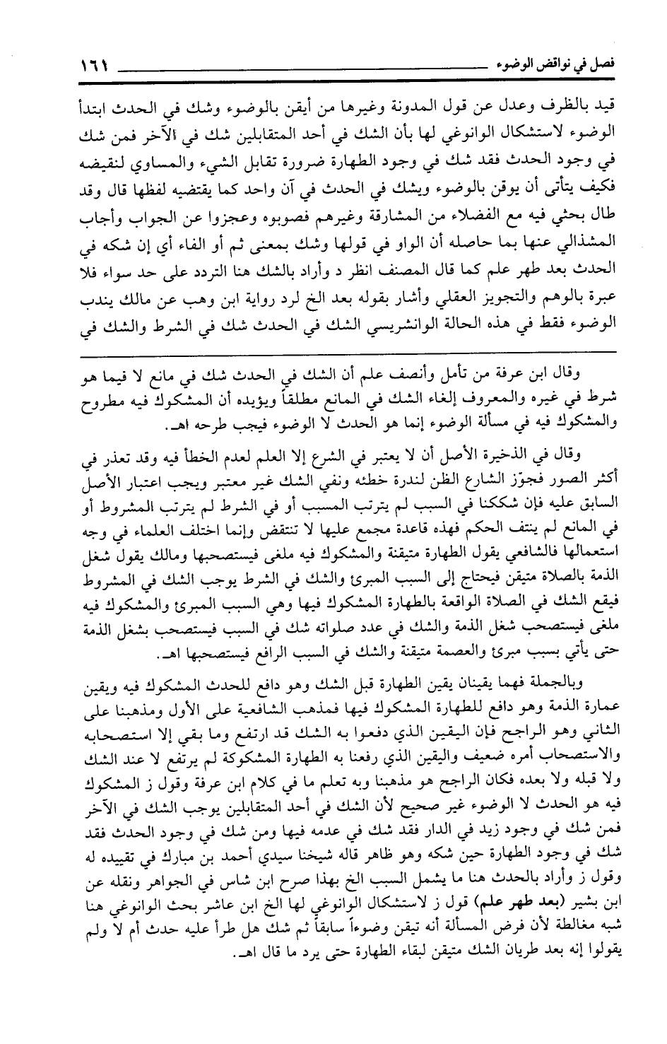 وقال ابن عرفة من تأمل وأنصف علم أن الشك في الحدث شك في مانع لا فيما هو شرط في غيره والمعروف إلغاء الشك في المانع مطلقًا ويؤيده أن المشكوك فيه مطروح والمشكوك فيه في مسألة الوضوء إنما هو الحدث لا الوضوء فيجب طرحه اهـ.
