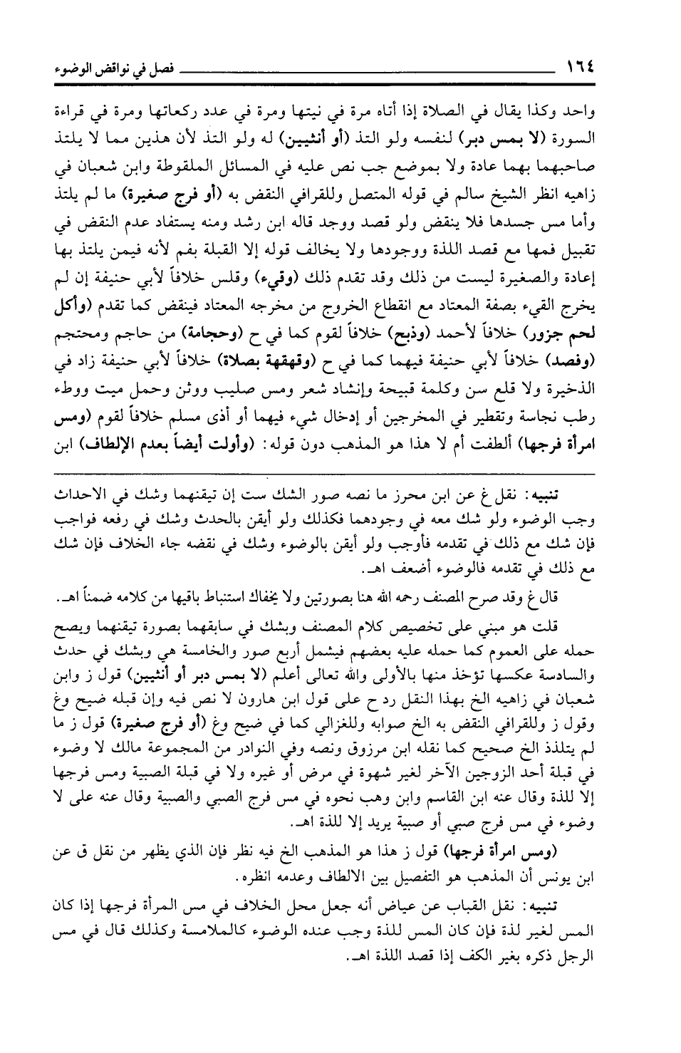 واحد وكذا يقال في الصلاة إذا أتاه مرة في نيتها ومرة في عدد ركعاتها ومرة في قراءة السورة (لا بمس دبر) لنفسه ولو التذ (أو أنثيين) له ولو التذ لأن هذين مما لا يلتذ صاحبهما بهما عادة ولا بموضع جب نص عليه في المسائل الملقوطة وابن شعبان في زاهيه انظر الشيخ سالم في قوله المتصل وللقرافي النقض به (أو فرج صغيرة) ما لم يلتذ وأما مس جسدها فلا ينقض ولو قصد ووجد قاله ابن رشد ومنه يستفاد عدم النقض في تقبيل فمها مع قصد اللذة ووجودها ولا يخالف قوله إلا القبلة بفم لأنه فيمن يلتذ بها إعادة والصغيرة ليست من ذلك وقد تقدم ذلك (وقيء) وقلس خلافًا لأبي حنيفة إن لم يخرج القيء بصفة المعتاد مع انقطاع الخروج من مخرجه المعتاد فينقض كما تقدم (وأكل لحم جزور) خلافًا لأحمد (وذبح) خلافًا لقوم كما في ح (وحجامة) من حاجم ومحتجم (وفصد) خلافًا لأبي حنيفة فيهما كما في ح (وقهقهة بصلاة) خلافًا لأبي حنيفة زاد في الذخيرة ولا قلع سنن وكلمة قبيحة وإنشاد شعر ومس صليب ووثن وحمل ميت ووطء رطب نجاسة وتقطير في المخرجين أو إدخال شيء فيهما أو أذى مسلم خلافًا لقوم (ومس امرأة فرجها) ألطفت أم لا هذا هو المذهب دون قوله: (وأولت أيضًا بعدم الإلطاف) ابن