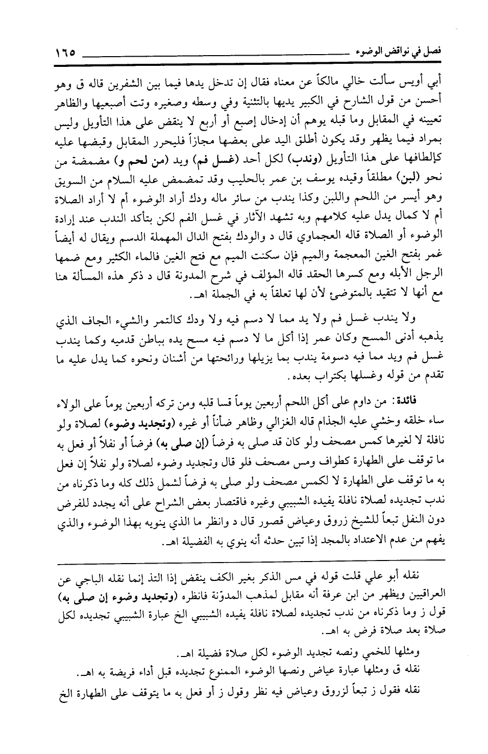 فائدة: من داوم على أكل اللحم أربعين يومًا قسا قلبه ومن تركه أربعين يومًا على الولاء ساء خلقه وخشي عليه الجذام قاله الغزالي وظاهر ضأنًا أو غيره (وتجديد وضوء) لصلاة ولو نافلة لا لغيرها كمس مصحف ولو كان قد صلى به فرضًا (إن صلى به) فرضًا أو نفلًا أو فعل به ما توقف على الطهارة كطواف ومس مصحف فلو قال وتجديد وضوء لصلاة ولو نفلًا إن فعل به ما توقف على الطهارة لا لكمس مصحف ولو صلى به فرضًا لشمل ذلك كله وما ذكرناه من ندب تجديده لصلاة نافلة يفيده الشبيبي وغيره فاقتصار بعض الشراح على أنه يجدد للفرض دون النفل تبعًا للشيخ زروق وعياض قصور قال د وانظر ما الذي ينويه بهذا الوضوء والذي يفهم من عدم الاعتداد بالمجد إذا تبين حدثه أنه ينوي به الفضيلة اهـ.