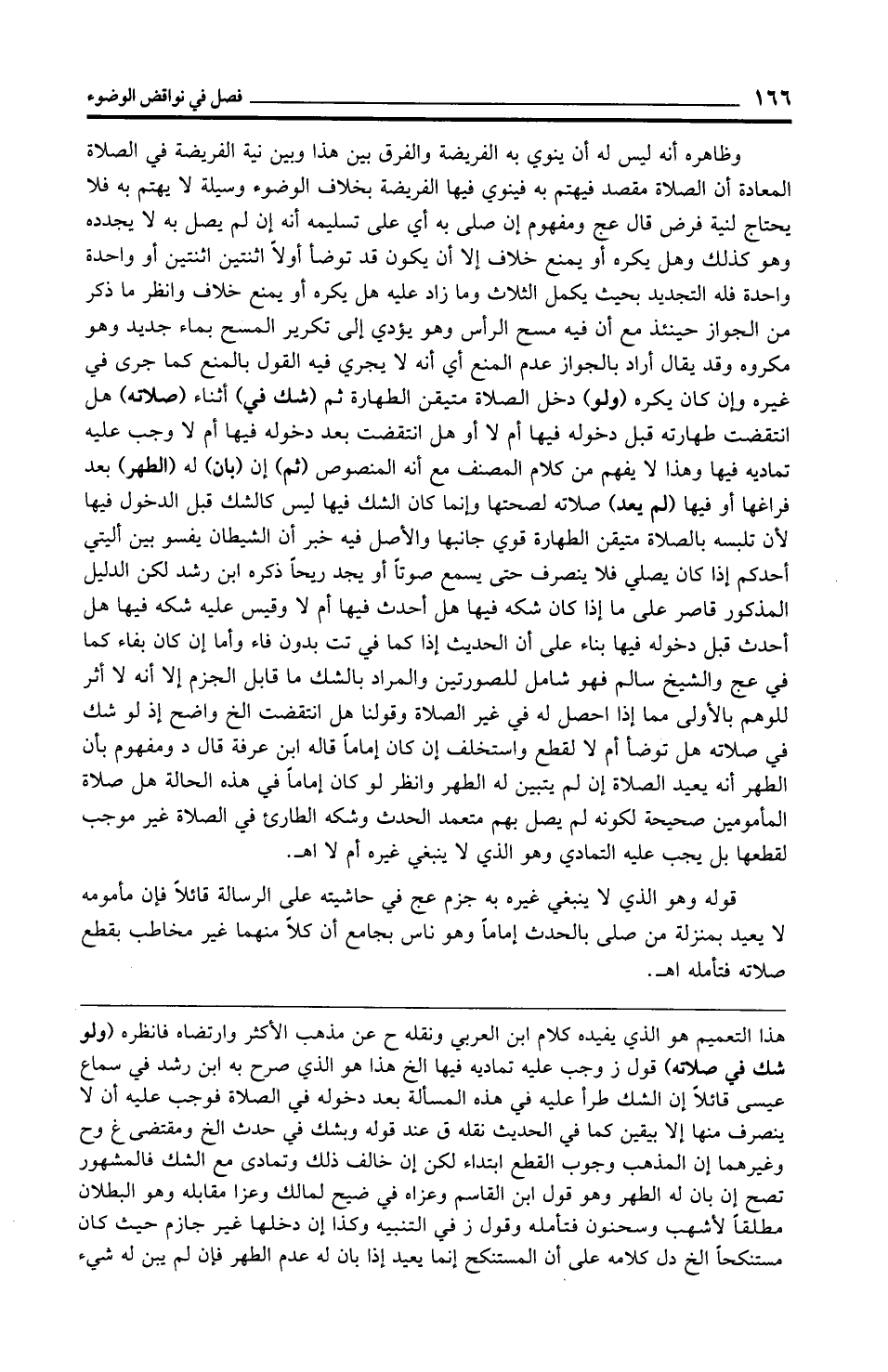 وظاهره أنه ليس له أن ينوي به الفريضة والفرق بين هذا وبين نية الفريضة في الصلاة المعادة أن الصلاة مقصد فيهتم به فينوي فيها الفريضة بخلاف الوضوء وسيلة لا يهتم به فلا يحتاج لنية فرض قال عج ومفهوم إن صلى به أي على تسليمه أنه إن لم يصل به لا يجدده وهو كذلك وهل يكره أو يمنع خلاف إلا أن يكون قد توضأ أولًا اثنتين اثنتين أو واحدة واحدة فله التجديد بحيث يكمل الثلاث وما زاد عليه هل يكره أو يمنع خلاف وانظر ما ذكر من الجواز حينئذ مع أن فيه مسح الرأس وهو يؤدي إلى تكرير المسح بماء جديد وهو مكروه وقد يقال أراد بالجواز عدم المنع أي أنه لا يجري فيه القول بالمنع كما جرى في غيره وإن كان يكره (ولو) دخل الصلاة متيقن الطهارة ثم (شك في) أثناء (صلاته) هل انتقضت طهارته قبل دخوله فيها أم لا أو هل انتقضت بعد دخوله فيها أم لا وجب عليه تماديه فيها وهذا لا يفهم من كلام المصنف مع أنه المنصوص (ثم) إن (بان) له (الطهر) بعد فراغها أو فيها (لم يعد) صلاته لصحتها وإنما كان الشك فيها ليس كالشك قبل الدخول فيها لأن تلبسه بالصلاة متيقن الطهارة قوي جانبها والأصل فيه خبر أن الشيطان يفسو بين أليتي أحدكم إذا كان يصلي فلا ينصرف حتى يسمع صوتًا أو يجد ريحًا ذكره ابن رشد لكن الدليل المذكور قاصر على ما إذا كان شكه فيها هل أحدث فيها أم لا وقيس عليه شكه فيها هل أحدث قبل دخوله فيها بناء على أن الحديث إذا كما في تت بدون فاء وأما إن كان بفاء كما في عج والشيخ سالم فهو شامل للصورتين والمراد بالشك ما قابل الجزم إلا أنه لا أثر للوهم بالأولى مما إذا حصل له في غير الصلاة وقولنا هل انتقضت الخ واضح إذ لو شك في صلاته هل توضأ أم لا لقطع واستخلف إن كان إمامًا قاله ابن عرفة قال د ومفهوم بأن الطهر أنه يعيد الصلاة إن لم يتبين له الظهر وانظر لو كان إمامًا في هذه الحالة هل صلاة المأمومين صحيحة لكونه لم يصل بهم متعمد الحدث وشكه الطاريء في الصلاة غير موجب لقطعها بل يجب عليه التمادي وهو الذي لا ينبغي غيره أم لا اهـ.