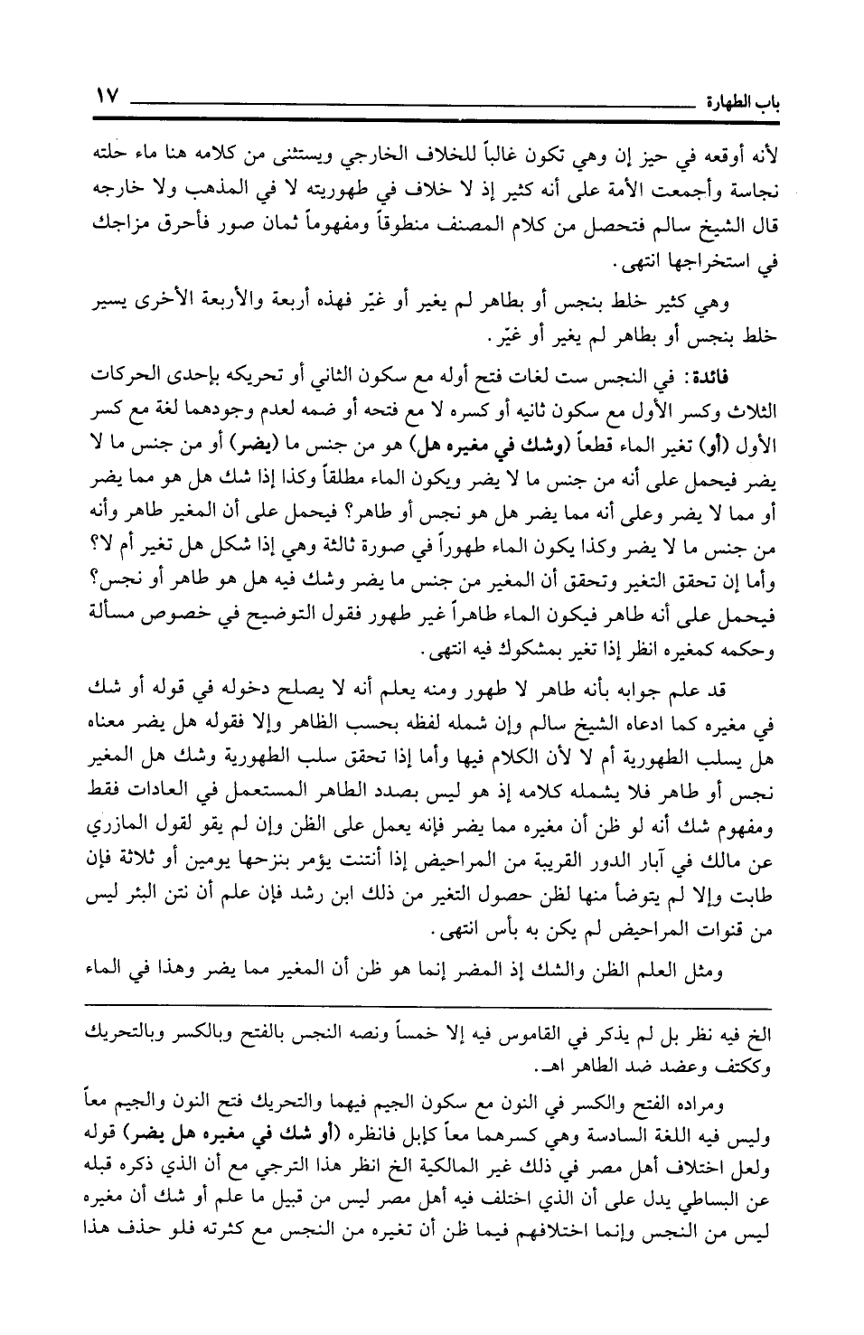 فائدة: في النجس ست لغات فتح أوله مع سكون الثاني أو تحريكه بإحدى الحركات الثلاث وكسر الأول مع سكون ثانيه أو كسره لا مع فتحه أو ضمه لعدم وجودهما لغة مع كسر الأول (أو) تغير الماء قطعًا (وشك في مغيره هل) هو من جنس ما (يضر) أو من جنس ما لا يضر فيحمل على أنه من جنس ما لا يضر ويكون الماء مطلقًا وكذا إذا شك هل هو مما يضر أو مما لا يضر وعلى أنه مما يضر هل هو نجس أو طاهر؟ فيحمل على أن المغير طاهر وأنه من جنس ما لا يضر وكذا يكون الماء طهورًا في صورة ثالثة وهي إذا شكل هل تغير أم لا؟ وأما إن تحقق التغير وتحقق أن المغير من جنس ما يضر وشك فيه هل هو طاهر أو نجس؟ فيحمل على أنه طاهر فيكون الماء طاهرًا غير طهور فقول التوضيح في خصوص مسألة وحكمه كمغيره انظر إذا تغير بمشكوك فيه انتهى.
