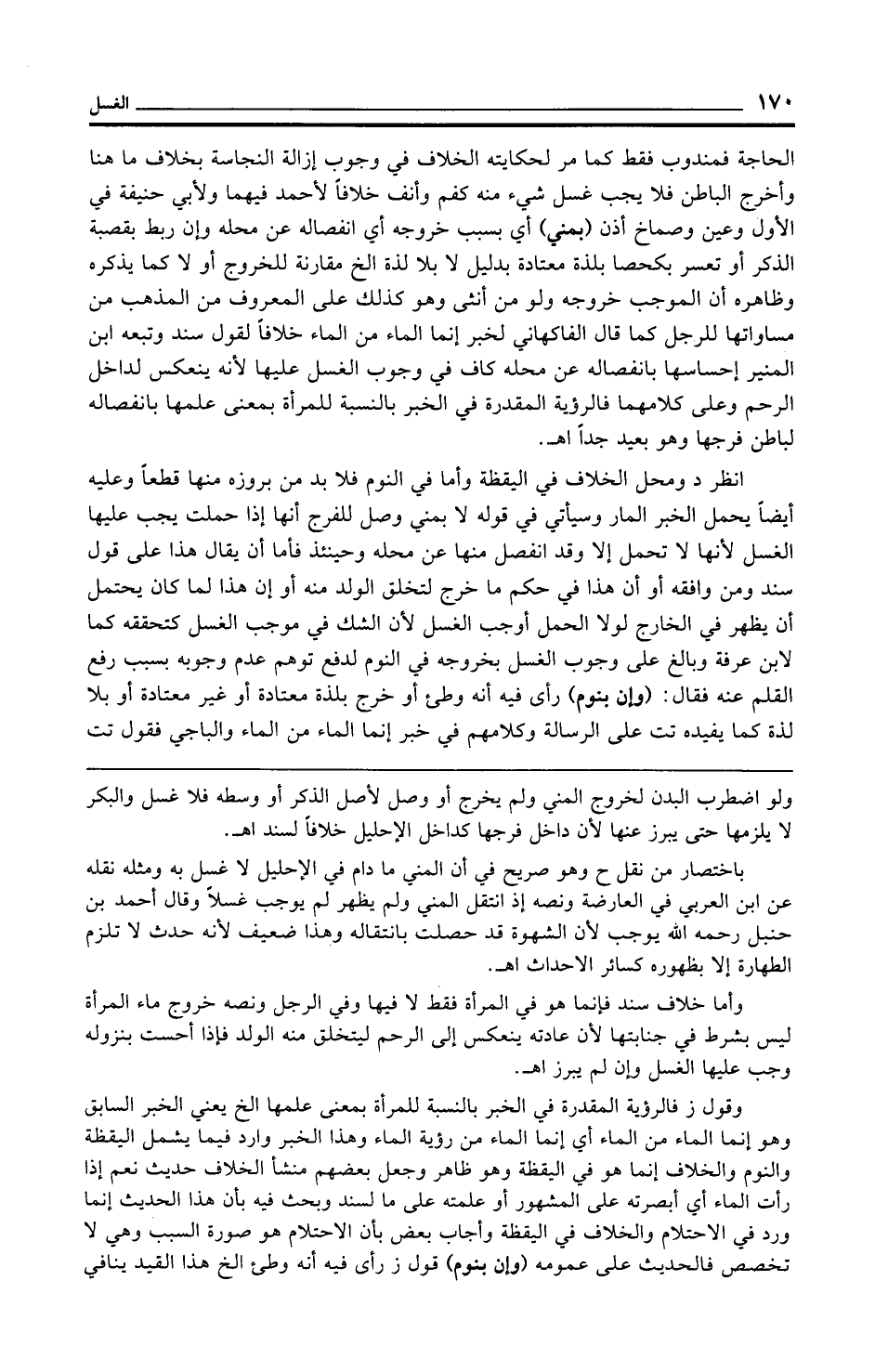باختصار من نقل ح وهو صريح في أن المني ما دام في الإحليل لا غسل به ومثله نقله عن ابن العربي في العارضة ونصه إذ انتقل المني ولم يظهر لم يوجب غسلًا وقال أحمد بن حنبل رحمه الله يوجب لأن الشهوة قد حصلت بانتقاله وهذا ضعيف لأنه حدث لا تلزم الطهارة إلا بظهوره كسائر الأحداث اهـ.