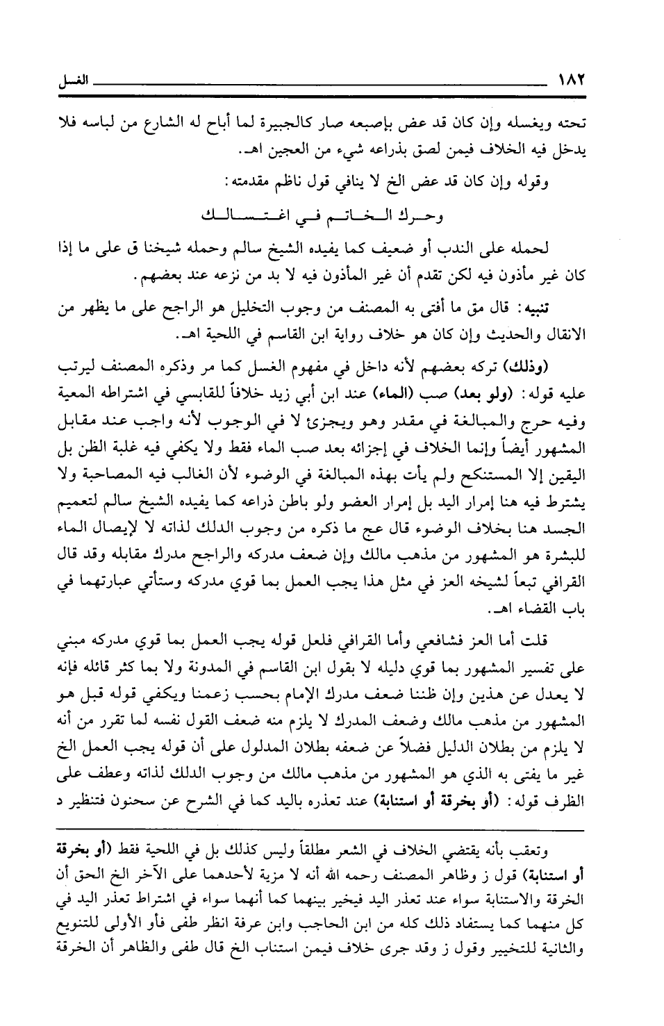 قلت أما العز فشافعي وأما القرافي فلعل قوله يجب العمل بما قوي مستدركه مبني على تفسير المشهور بما قوي دليله لا يقول ابن القاسم في المدونة ولا بما أكثر قائله فإنه لا يعدل عن هذين وإن ظننا ضعف مدرك الإِمام بحسب زعمنا ويكفي قوله قبل هو المشهور من مذهب مالك وضعف المدرك لا يلزم منه ضعف القول نفسه لما تقرر من أنه لا يلزم من بطلان الدليل فضلًا عن ضعفه بطلان المدلول على أن قوله يجب العمل الخ غير ما يفتى به الذي هو المشهور من مذهب مالك من وجوب الدلك لذاته وعطف على الظرف قوله: (أو بخرقة أو استنابة) عند تعذره باليد كما في الشرح عن سحنون فتنظير د