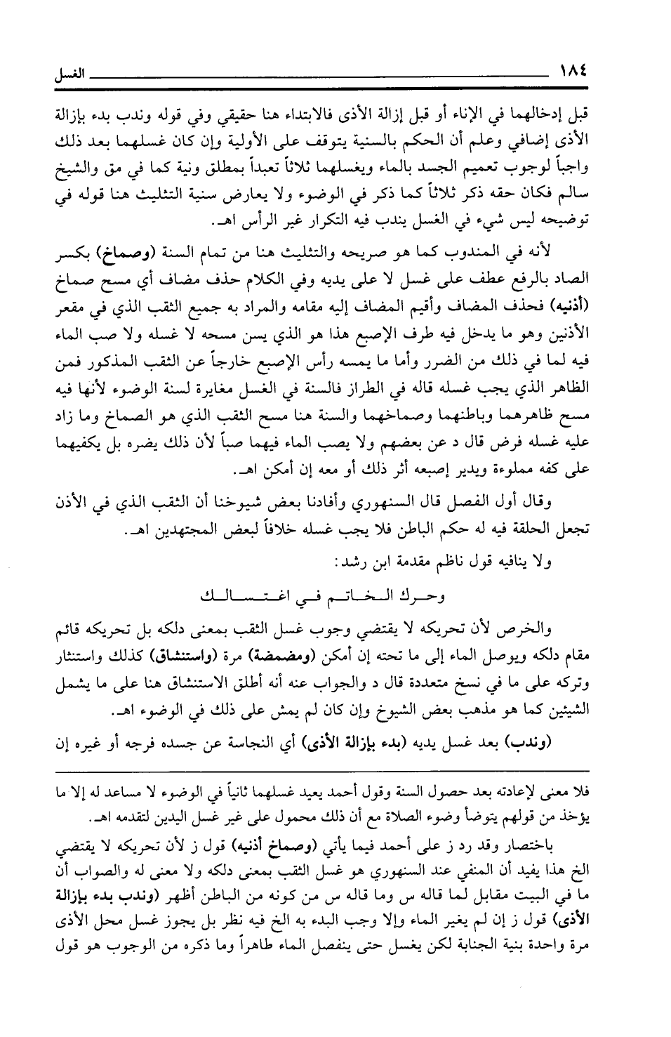 باختصار وقد رد ز على أحمد فيما يأتي (وصماخ أذنيه) قول ز لأن تحريكه لا يقتضي الخ هذا يفيد أن المنفي عند السنهوري هو غسل الثقب بمعنى دلكه ولا معنى له والصواب أن ما في البيت مقابل لما قاله س وما قاله س من كونه من الباطن أظهر (وندب بدء بإزالة الأذى) قول ز إن لم يغير الماء وإلا وجب البدء به الخ فيه نظر بل يجوز غسل محل الأذى مرة واحدة بنية الجنابة لكن يغسل حتى ينفصل الماء طاهرًا وما ذكره من الوجوب هو قول