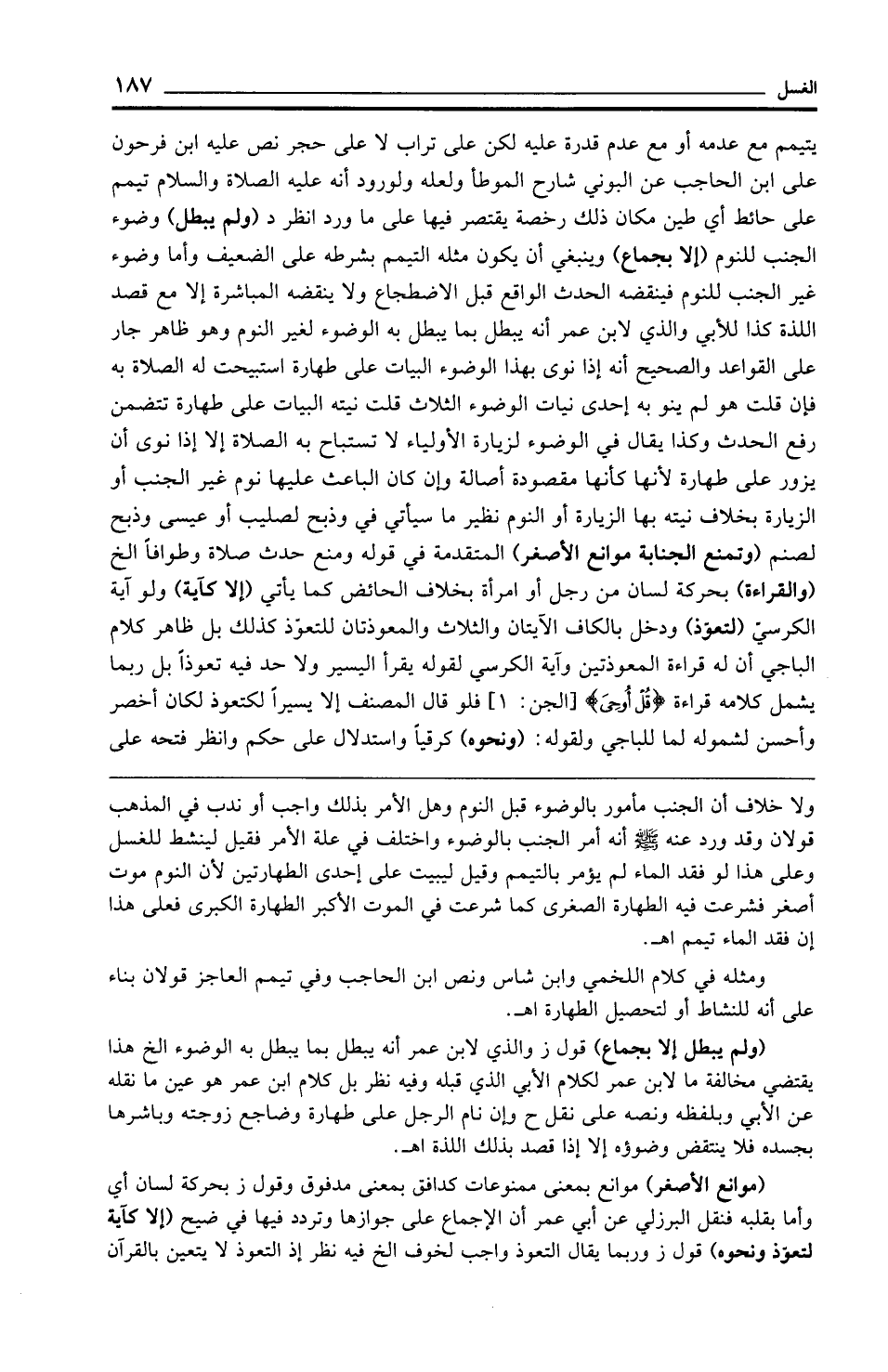 ولا خلاف أن الجنب مأمور بالوضوء قبل النوم وهل الأمر بذلك واجب أو ندب في المذهب قولان وقد ورد عنه - صلى الله عليه وسلم - أنه أمر الجنب بالوضوء واختلف في علة الأمر فقيل لينشط للغسل وعلى هذا لو فقد الماء لم يؤمر بالتيمم وقيل ليبيت على إحدى الطهارتين لأن النوم موت أصغر فشرعت فيه الطهارة الصغرى كما شرعت في الموت الأكبر الطهارة الكبرى فعلى هذا إن فقد الماء تيمم اهـ.