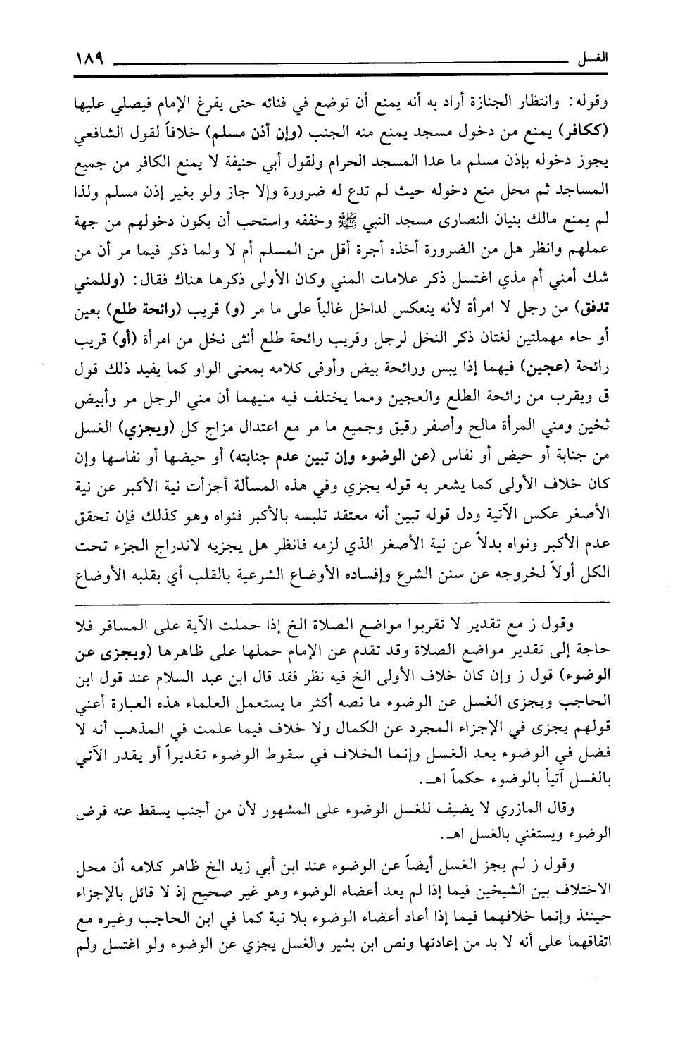 وقوله: وانتظار الجنازة أراد به أنه يمنع أن توضع في فنائه حتى يفرغ الإِمام فيصلي عليها (ككافر) يمنع من دخول مسجد يمنع منه الجنب (وإن أذن مسلم) خلافًا لقول الشافعي يجوز دخوله بإذن مسلم ما عدا المسجد الحرام ويقول أبي حنيفة لا يمنع الكافر من جميع المساجد ثم محل منع دخوله حيث لم تدع له ضرورة وإلا جاز ولو بغير إذن مسلم ولذا لم يمنع مالك بنيان النصارى مسجد النبي - صلى الله عليه وسلم - وخففه واستحب أن يكون دخولهم من جهة عملهم وانظر هل من الضرورة أخذه أجرة أقل من المسلم أم لا ولما ذكر فيما مر أن من شك أمني أم مذي اغتسل ذكر علامات المني وكان الأولى ذكرها هناك فقال: (وللمني تدفق) من رجل لا امرأة لأنه ينعكس لداخل غالبًا على ما مر (و) قريب (رائحة طلع) بعين أو جاء مهملتين لغتان ذكر النخل لرجل وقريب رائحة طلع أنثى نخل من امرأة (أو) قريب رائحة (عجين) فيهما إذا يبس ورائحة بيض وأوفى كلامه بمعنى الواو كما يفيد ذلك قول ق ويقرب من رائحة الطلع والعجين ومما يختلف فيه منيهما أن مني الرجل مر وأبيض ثخين ومني المرأة مالح وأصفر رقيق وجميع ما مر مع اعتدال مزاج كل (ويجزي) الغسل من جنابة أو حيض أو نفاس (عن الوضوء وإن تبين عدم جنابته) أو حيضها أو نفاسها وإن كان خلاف الأولى كما يشعر به قوله يجزي وفي هذه المسألة أجزأت نية الأكبر عن نية الأصغر عكس الآتية ودل قوله تبين أنه معتقد تلبسه بالأكبر فنواه وهو كذلك فإن تحقق عدم الأكبر ونواه بدلًا عن نية الأصغر الذي لزمه فانظر هل يجزيه لاندراج الجزء تحت الكل أولًا لخروجه عن سنن الشرع وإفساده الأوضاع الشرعية بالقلب أي بقلبه الأوضاع