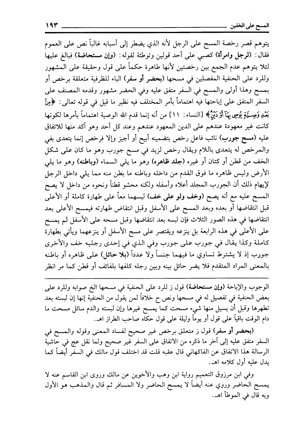الوجوب والإباحة (وإن مستحاضة) قول ز للرد على الحنفية في مسحها الخ صوابه وللرد على بعض الحنفية في تفصيل له في مسحها ونص ح خلافًا لمن يقول من الحنفية إنها إن لبسته بعد تطهرها وقبل أن يسيل منها شيء مسحت كما يمسح غيرها وان لبسته والدم سائل مسحت ما دام الوقت باقيًا على قول أو يومًا وليلة على قول حكاه صاحب الطراز اهـ.