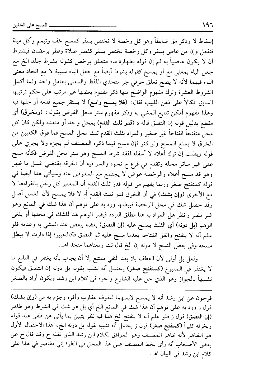 إسقاط لا وذكر مق ضابطًا وهو كل رخصة لا تختص بسفر كمسح خف وتيمم وأكل ميتة فتفعل وإن من عاص بسفر وكل رخصة تختص بسفر كقصر صلاة وفطر برمضان فيشترط أن لا يكون عاصيًا به ثم إن قوله بطهارة ماء متعلق برخص كقوله بشرط جلد الخ مع جعل الباء بمعنى مع أو بمسح كقوله بشرط أيضًا مع جعل الباء سببية لا مع اتحاد معنى الباء فيهما لأنه لا يصح تعلق حرفي جر متحدي اللفظ والمعنى بعامل واحد ولما أكمل الشروط العشرة وترك مفهوم الواضح منها ذكر مفهوم بعضها غير مرتب على حكم ترتيبها السابق اتكالًا على ذهن اللبيب فقال: (فلا يمسح واسع) لا يستقر جميع قدمه أو جلها فيه وهذا مفهوم أمكن تتابع المشي به وذكر مفهوم ستر محل الفرض بقوله: (ومخرق) أي مقطع بدليل قوله إن التصق قاله د (قدر ثلث القدم) بمحل واحد أو متعدد ولكن كان كل محل منفتحًا انفتاحًا غير صغير والمراد بثلث القدم ثلث محل المسح فما فوق الكعبين من الخرق لا يمنع المسح ولو أكثر فإن مسح فيما ذكره المصنف لم يجزه ولا يجري على قوله وبطلت إن ترك أعلاه لا أسفله لفقد شرط المسح وهو ستر محل الفرض فكأنه مسح على غير ساتر محله وتقدم في فرع ح نحوه والسر فيه أن تخرقه يقتضي غسل ما ظهر وهو قد مسح أعلاه والرخصة عوض لا يجتمع مع المعوض عنه وسيأتي هذا أيضًا في قوله كمنفتح صغر وربما يفهم من قوله قدر ثلث القدم أن المعتبر كل رجل بانفرادها لا مع الأخرى (وإن بشك) في أن الخرق قدر ثلث القدم أم لا فلا يمسح لأن الغسل أصل وقد حصل شك في محل الرخصة فيبطلها ورد به على توهم أن هذا شك في المانع وهو غير مضر وانظر هل المراد به هنا مطلق التردد فيضر الوهم هنا للشك في محلها أو يلغى الوهم (بل دونه) أي الثلث يمسح عليه (إن التصق) بعضه ببعض عند المشي به وعدمه فلو علم أنه لا ينفتح واتفق انفتاحه بعدما مسح عليه ثم التصق فكالجبيرة إذا دارت لا يبطل مسحه وفي بعض النسخ لا دونه إن الخ قال تت ومعناهما متحد اهـ.
