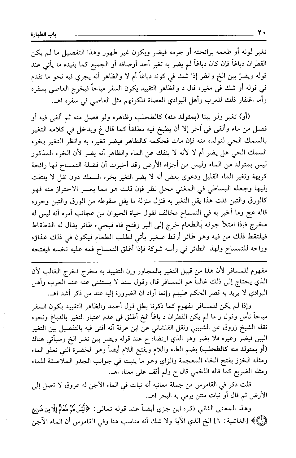 (أو) تغير ولو بينا (بمتولد منه) كالطحلب وظاهره ولو فصل منه ثم ألقى فيه أو فصل من ماء وألقى في آخر إلا أن يطبخ فيه مطلقًا كما قال غ ويدخل في كلامه التغير بالسمك الحي لتولده منه فإن مات فحكمه كالطاهر فيضر تغيره به وانظر التغير بخرء السمك الحي هل يضر أم لا لأنه لا ينفك عن الماء والظاهر أنه يضر لأن الخرء المذكور ليس بمتولد من الماء وليس من أجزاء الأرض وقد أخبرت أن فضلة التمساح لها رائحة كريهة وتغير الماء القليل ودعوى بعض أنه لا يضر التغير بخرء السمك دون نقل لا يلتفت إليها وجعله البساطي في المغني محل نظر فإن قلت هو مما يعسر الاحتراز منه فهو كالورق والتبن قلت هذا يقل التغير به فنزل منزلة ما يقل سقوطه من الورق والتبن وحرره قاله عج وما أخبر به في التمساح مخالف لقول حياة الحيوان من عجائب أمره أنه ليس له مخرج فإذا امتلأ جوفه بالطعام خرج إلى البر وفتح فاه فيجيء طائر يقال له القطقاط فيلتقط ذلك من فيه وهو طائر أرقط صغير يأتي لطلب الطعام فيكون في ذلك غذاؤه وراحه للتمساح ولهذا الطائر في رأسه شوكة فإذا أغلق التمساح فمه عليه نخسه فيفتحه