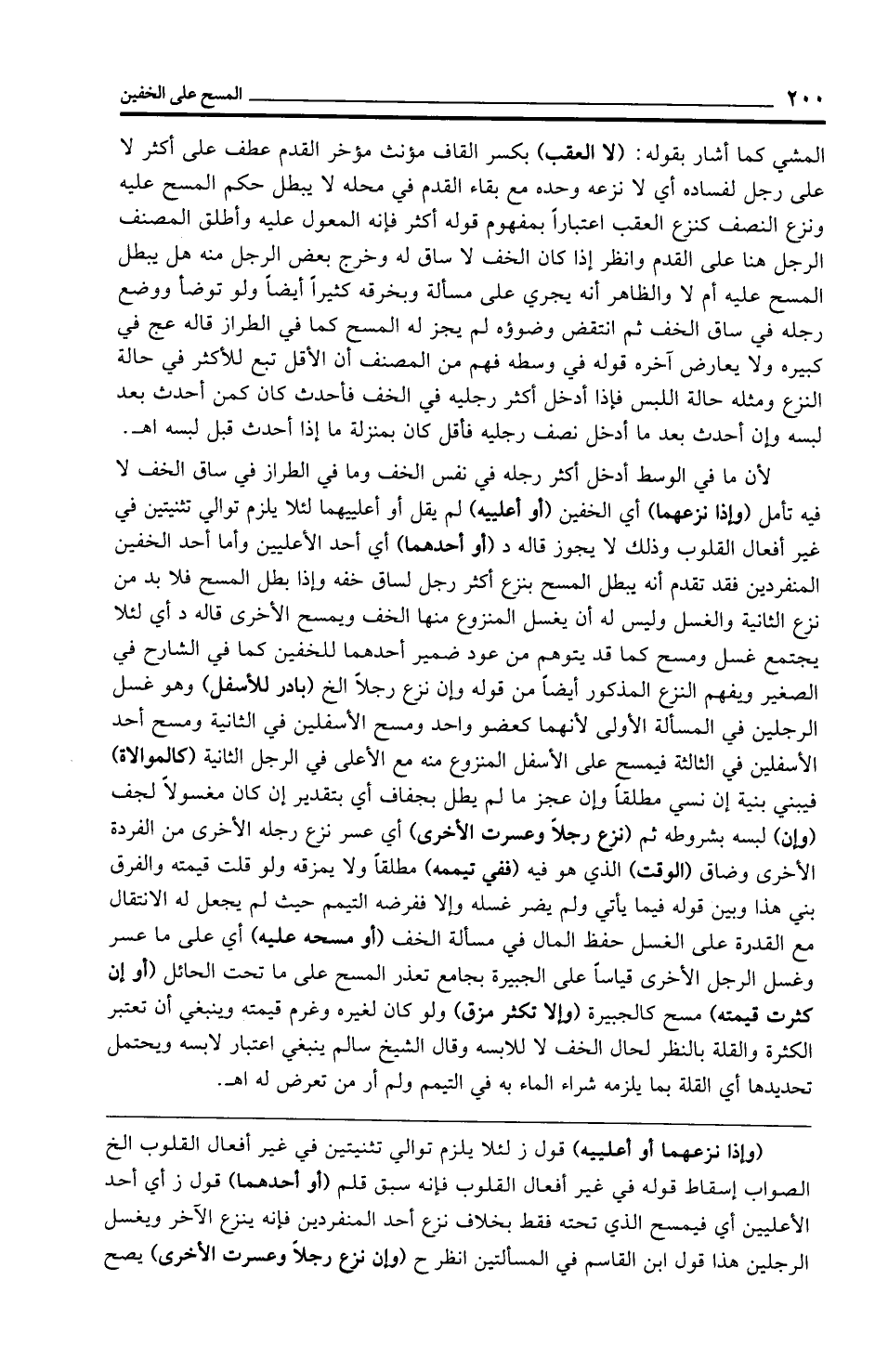 لأن ما في الوسط أدخل أكثر رجله في نفس الخف وما في الطراز في ساق الخف لا فيه تأمل (وإذا نزعهما) أي الخفين (أو أعلييه) لم يقل أو أعلييهما لئلا يلزم توالي تثنيتين في غير أفعال القلوب وذلك لا يجوز قاله د (أو أحدهما) أي أحد الأعليين وأما أحد الخفين المنفردين فقد تقدم أنه يبطل المسح بنزع أكثر رجل لساق خفه وإذا بطل المسح فلا بد من نزع الثانية والغسل وليس له أن يغسل المنزوع منها الخف ويمسح الأخرى قاله د أي لئلا يجتمع غسل ومسح كما قد يتوهم من عود ضمير أحدهما للخفين كما في الشارح في الصغير ويفهم النزع المذكور أيضًا من قوله وإن نزع رجلًا الخ (بادر للأسفل) وهو غسل الرجلين في المسألة الأولى لأنهما كعضو واحد ومسح الأسفلين في الثانية ومسح أحد الأسفلين في الثالثة فيمسح على الأسفل المنزوع منه مع الأعلى في الرجل الثانية (كالموالاة) فيبني بنية إن نسي مطلقًا وإن عجز ما لم يطل بجفاف أي بتقدير إن كان مغسولًا لجف (وإن) لبسه بشروطه ثم (نزع رجلًا وعسرت الأخرى) أي عسر نزع رجله الأخرى من الفردة الأخرى وضاق (الوقت) الذي هو فيه (ففي تيممه) مطلقًا ولا يمزقه ولو قلت قيمته والفرق بني هذا وبين قوله فيما يأتي ولم يضر غسله وإلا ففرضه التيمم حيث لم يجعل له الانتقال مع القدرة على الغسل حفظ المال في مسألة الخف (أو مسحه عليه) أي على ما عسر وغسل الرجل الأخرى قياسًا على الجبيرة بجامع تعذر المسح على ما تحت الحائل (أو إن كثرت قيمته) مسح كالجبيرة (وإلا تكثر مزق) ولو كان لغيره وغرم قيمته وينبغي أن تعتبر الكثرة والقلة بالنظر لحال الخف لا للابسه وقال الشيخ سالم ينبغي اعتبار لابسه ويحتمل تحديدها أي القلة بما يلزمه شراء الماء به في التيمم ولم أر من تعرض له اهـ.