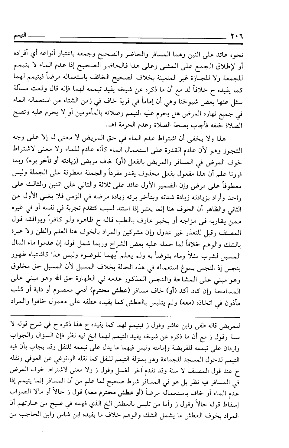 للمريض قاله طفى وابن عاشر وقول ز فيتيمم لهما كما يفيده ح هذا ذكره ح في شرح قوله لا سنة وقول ز مع أن ما ذكره عن شيخه يفيد التيمم لهما الخ فيه نظر فإن السؤال والجواب واردان على تيممه للفريضة وإمامته وليس فيهما ما يدل على تيممه للنفل وقد يجاب بأن فيه التيمم لدخول المسجد للجماعة وهو بمنزلة التيمم للنفل كما نقله الوانوغي عن العوفي ونقله ح عند قول المصنف لا سنة وقد تقدم آخر الغسل وقول ز ولا معنى لاشتراط خوف المرض في المسافر فيه نظر بل هو في المسافر شرط صحيح لما علم من أن المسافر إنما يتيمم إذا عدم الماء أو خاف باستعماله مرضًا (أو عطش محترم معه) قول ز حالًا أو مآلا الصواب إسقاط قوله حالًا وقول ز وأما من تلبس بالعطش الخ الذي فهمه في ضيح من عبارتهم أن المراد بخوف العطش ما يشمل الشك والوهم خلاف ما يفيده ابن شاس وابن الحاجب من