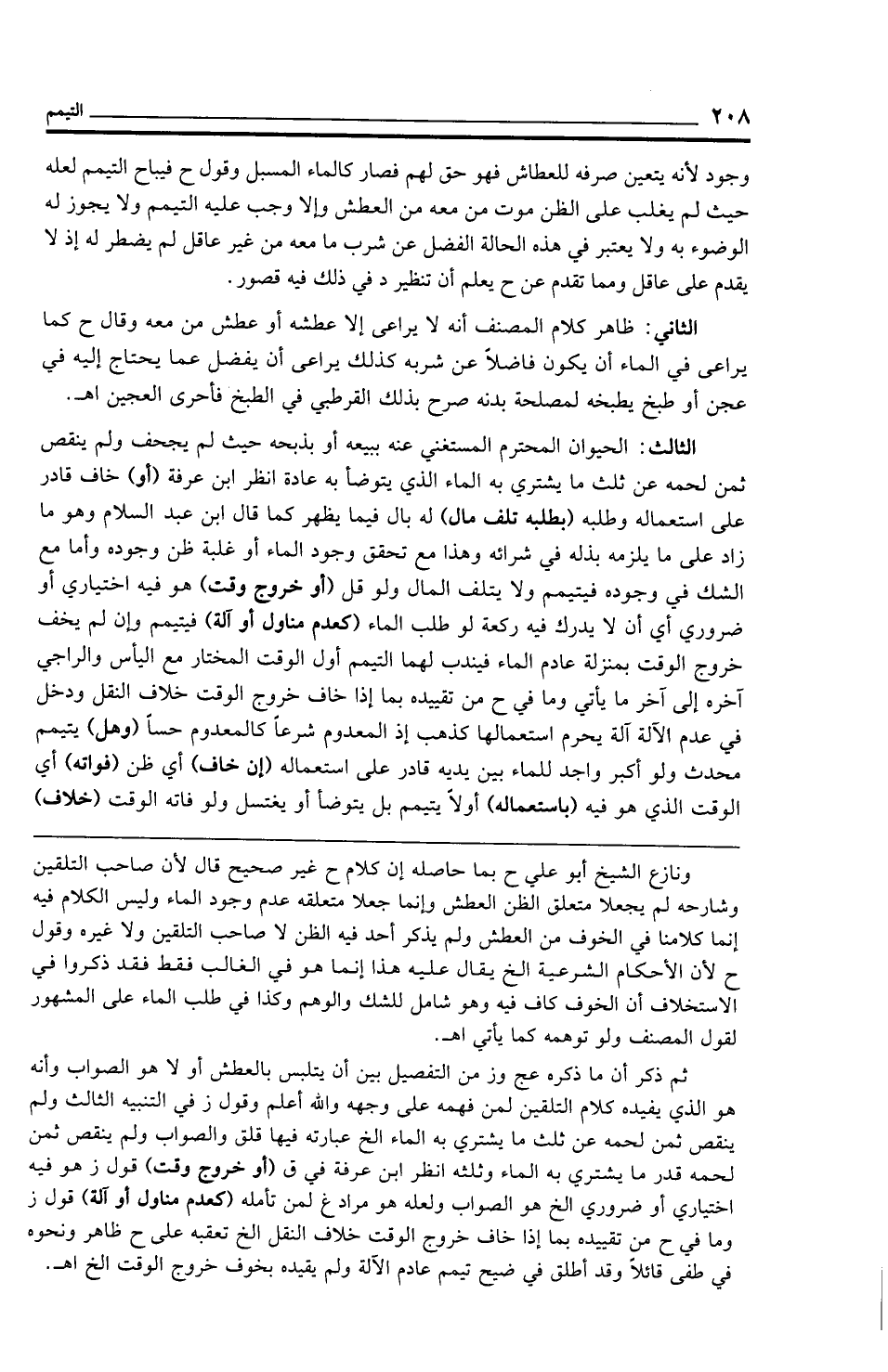 ثم ذكر أن ما ذكر عج وز من التفصيل بين أن يتلبس بالعطش أو لا هو الصواب وأنه هو الذي يفيده كلام التلقين لمن فهمه على وجهه والله أعلم وقول ز في التنبيه الثالث ولم ينقص ثمن لحمه عن ثلث ما يشتري به الماء الخ عبارته فيها قلق والصواب ولم ينقص ثمن لحمه قدر ما يشتري به الماء وثلثه انظر ابن عرفة في ق (أو خروج وقت) قول ز هو فيه اختياري أو ضروري الخ هو الصواب ولعله هو مراد غ لمن تأمله (كعدم مناول أو آلة) قول ز وما في ح من تقييده بما إذا خاف خروج الوقت خلاف النقل الخ تعقبه على ح ظاهر ونحوه في طفى قائلًا وقد أطلق في ضيح تيمم عادم الآلة ولم يقيده بخوف خروج الوقت الخ اهـ.