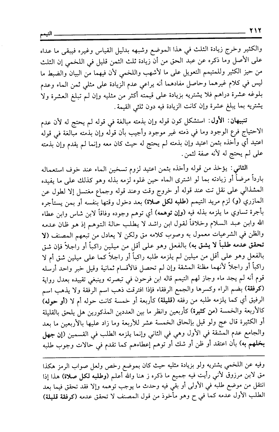 والكثير وخرج زيادة الثلث في هذا الموضع وشبهه بدليل القياس وغيره فيبقى ما عداه على الأصل وما ذكره عن عبد الحق من أن زيادة ثلث الثمن قليل في اللخمي إن الثلث من حيز الكثير وللمتيمم التعويل على ما لأشهب واللخمي لأن فيهما من البيان والضبط ما ليس في كلام غيرهما وحاصل مفادهما أنه يراعي عدم الزيادة على مثلي ثمن الماء وعدم بلوغه عشرة دراهم فلا يشتريه بزيادة على قيمته أكثر من مثليه وإن لم تبلغ العشرة ولا يشتريه بما يبلغ عشرة وإن كانت الزيادة فيه دون ثلثي القيمة.