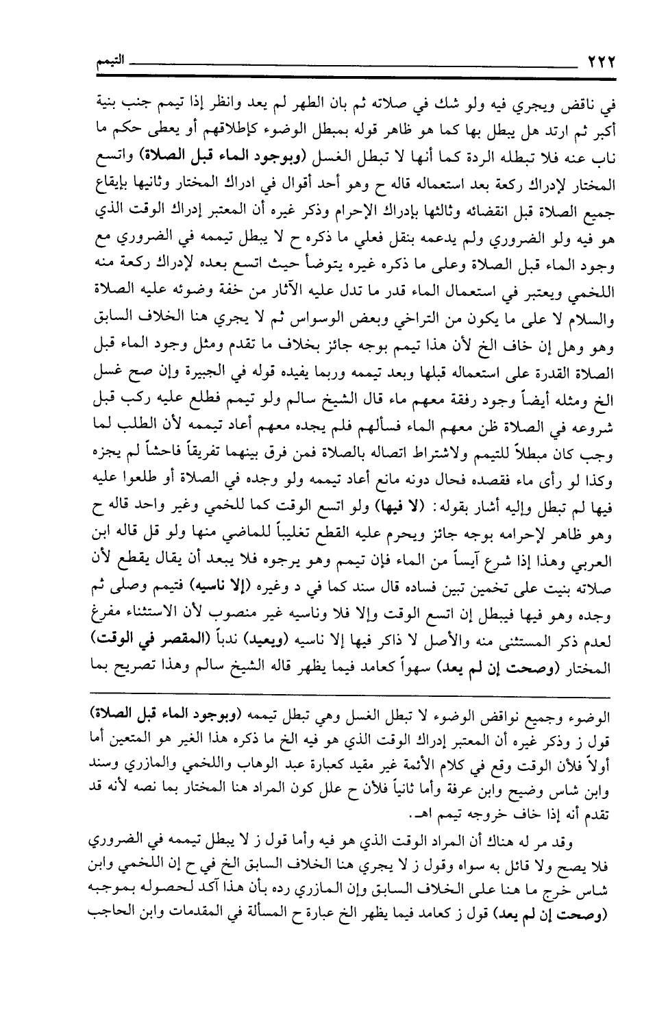 في ناقض ويجري فيه ولو شك في صلاته ثم بان الطهر لم يعد وانظر إذا تيمم جنب بنية أكبر ثم ارتد هل يبطل بها كما هو ظاهر قوله بمبطل الوضوء كإطلاقهم أو يعطى حكم ما ناب عنه فلا تبطله الردة كما أنها لا تبطل الغسل (وبوجود الماء قبل الصلاة) واتسع المختار لإدراك ركعة بعد استعماله قاله ح وهو أحد أقوال في إدراك المختار وثانيها بإيقاع جميع الصلاة قبل انقضائه وثالثها بإدراك الإحرام وذكر غيره أن المعتبر إدراك الوقت الذي هو فيه ولو الضروري ولم يدعمه بنقل فعلي ما ذكره ح لا يبطل تيممه في الضروري مع وجود الماء قبل الصلاة وعلى ما ذكره غيره يتوضأ حيث اتسع بعده لإدراك ركعة منه اللخمي ويعتبر في استعمال الماء قدر ما تدل عليه الآثار من خفة وضوئه عليه الصلاة والسلام لا على ما يكون من التراخي وبعض الوسواس ثم لا يجري هنا الخلاف السابق وهو وهل إن خاف الخ لأن هذا تيمم بوجه جائز بخلاف ما تقدم ومثل وجود الماء قبل الصلاة القدرة على استعماله قبلها وبعد تيممه وربما يفيده قوله في الجبيرة وإن صح غسل الخ ومثله أيضًا وجود رفقة معهم ماء قال الشيخ سالم ولو تيمم فطلع عليه ركب قبل شروعه في الصلاة ظن معهم الماء فسألهم فلم يجده معهم أعاد تيممه لأن الطلب لما وجب كان مبطلًا للتيمم ولاشتراط اتصاله بالصلاة فمن فرق بينهما تفريقًا فاحشًا لم يجزه وكذا لو رأى ماء فقصده فحال دونه مانع أعاد تيممه ولو وجده في الصلاة أو طلعوا عليه فيها لم تبطل وإليه أشار بقوله: (لا فيها) ولو اتسع الوقت كما للخمي وغير واحد قاله ح وهو ظاهر لإحرامه بوجه جائز ويحرم عليه القطع تغليبًا للماضي منها ولو قل قاله ابن العربي وهذا إذا شرع آيسًا من الماء فإن تيمم وهو يرجوه فلا يبعد أن يقال يقطع لأن صلاته بنيت على تخمين تبين فساده قال سند كما في د وغيره (إلا ناسيه) فتيمم وصلى ثم وجده وهو فيها فيبطل إن اتسع الوقت وإلا فلا وناسيه غير منصوب لأن الاستثناء مفرغ لعدم ذكر المستثنى منه والأصل لا ذاكر فيها إلا ناسيه (ويعيد) ندبًا (المقصر في الوقت) المختار (وصحت إن لم يعد) سهوًا كعامد فيما يظهر قاله الشيخ سالم وهذا تصريح بما