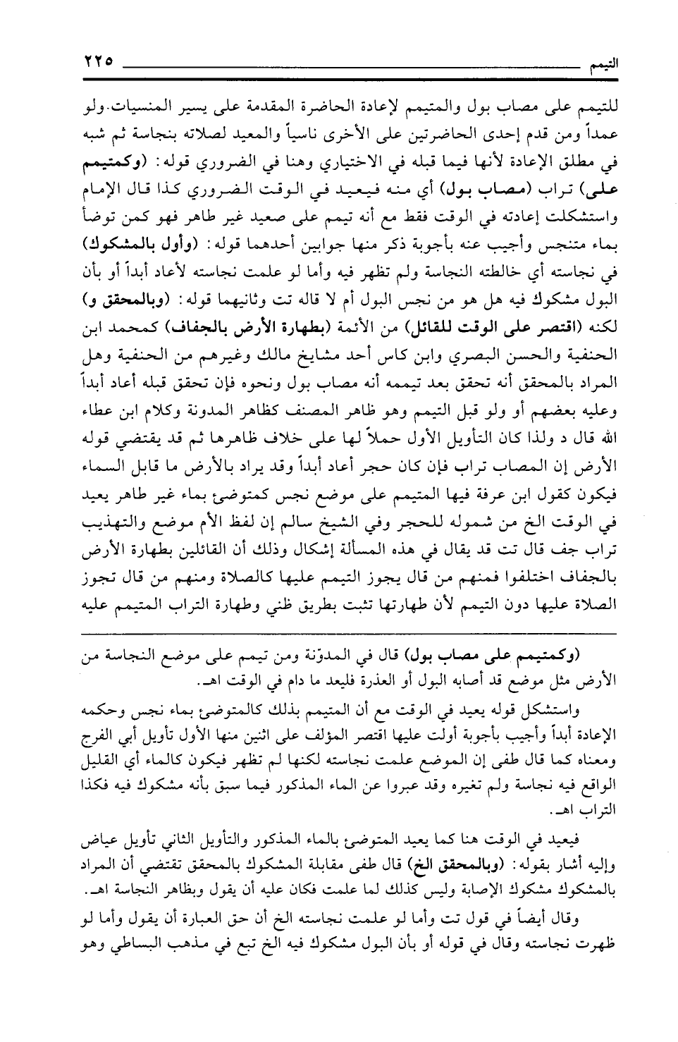 للتيمم على مصاب بول والمتيمم لإعادة الحاضرة المقدمة على يسير المنسيات ولو عمدًا ومن قدم إحدى الحاضرتين على الأخرى ناسيًا والمعيد لصلاته بنجاسة ثم شبه في مطلق الإعادة لأنها فيما قبله في الاختياري وهنا في الضروري قوله: (وكمتيمم على) تراب (مصاب بول) أي منه فيعيد في الوقت الضروري كذا قال الإِمام واستشكلت إعادته في الوقت فقط مع أنه تيمم على صعيد غير طاهر فهو كمن توضأ بماء متنجس وأجيب عنه بأجوبة ذكر منها جوابين أحدهما قوله: (وأول بالمشكوك) في نجاسته أي خالطته النجاسة ولم تظهر فيه وأما لو علمت نجاسته لأعاد أبدًا أو بأن البول مشكوك فيه هل هو من نجس البول أم لا قاله تت وثانيهما قوله: (وبالمحقق و) لكنه (اقتصر على الوقت للقائل) من الأئمة (بطهارة الأرض بالجفاف) كمحمد ابن الحنفية والحسن البصري وابن كاس أحد مشايخ مالك وغيرهم من الحنفية وهل المراد بالمحقق أنه تحقق بعد تيممه أنه مصاب بول ونحوه فإن تحقق قبله أعاد أبدًا وعليه بعضهم أو ولو قبل التيمم وهو ظاهر المصنف كظاهر المدونة وكلام ابن عطاء الله قال د ولذا كان التأويل الأول حملًا لها على خلاف ظاهرها ثم قد يقتضي قوله الأرض إن المصاب تراب فإن كان حجر أعاد أبدًا وقد يراد بالأرض ما قابل السماء فيكون يقول ابن عرفة فيها المتيمم على موضع نجس كمتوضيء بماء غير طاهر يعيد في الوقت الخ من شموله للحجر وفي الشيخ سالم إن لفظ الأم موضع والتهذيب تراب جف قال تت قد يقال في هذه المسألة إشكال وذلك أن القائلين بطهارة الأرض بالجفاف اختلفوا فمنهم من قال يجوز التيمم عليها كالصلاة ومنهم من قال تجوز الصلاة عليها دون التيمم لأن طهارتها تثبت بطريق ظني وطهارة التراب المتيمم عليه