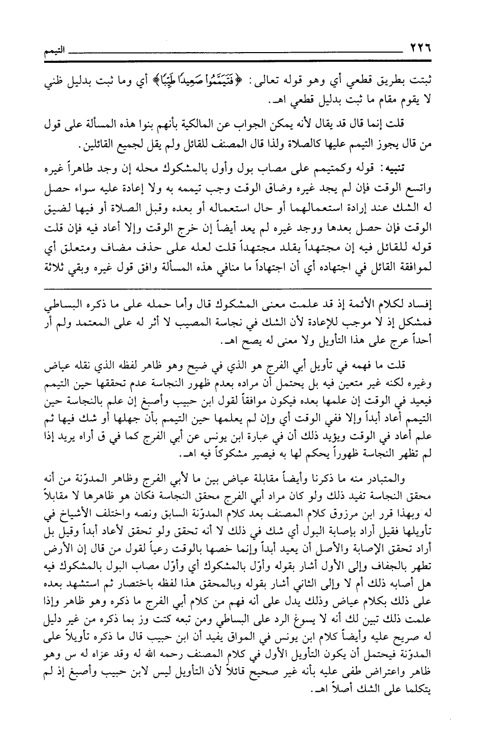والمتبادر منه ما ذكرنا وأيضًا مقابلة عياض بين ما لأبي الفرج وظاهر المدوّنة من أنه محقق النجاسة تفيد ذلك ولو كان مراد أبي الفرج محقق النجاسة فكان هو ظاهرها لا مقابلًا له وبهذا قرر ابن مرزوق كلام المصنف بعد كلام المدوّنة السابق ونصه واختلف الأشياخ في تأويلها فقيل أراد بإصابة البول أي شك في ذلك لا أنه تحقق ولو تحقق لأعاد أبدًا وقيل بل أراد تحقق الإصابة والأصل أن يعيد أبدًا وإنما خصها بالوقت رعيًا لقول من قال إن الأرض تطهر بالجفاف وإلى الأول أشار بقوله وأول بالمشكوك أي وأول مصاب البول بالمشكوك فيه هل أصابه ذلك أم لا وإلى الثاني أشار بقوله وبالمحقق هذا لفظه باختصار ثم استشهد بعده على ذلك بكلام عياض وذلك يدل على أنه فهم من كلام أبي الفرج ما ذكره وهو ظاهر وإذا علمت ذلك تبين لك أنه لا يسوغ الرد على البساطي ومن تبعه كنت وز بما ذكره من غير دليل له صريح عليه وأيضًا كلام ابن يونس في المواق يفيد أن ابن حبيب قال ما ذكره تأويلًا على المدوّنة فيحتمل أن يكون التأويل الأول في كلام المصنف رحمه الله له وقد عزاه له س وهو ظاهر واعتراض طفى عليه بأنه غير صحيح قائلًا لأن التأويل ليس لابن حبيب وأصبغ إذ لم يتكلما على الشك أصلًا اهـ.