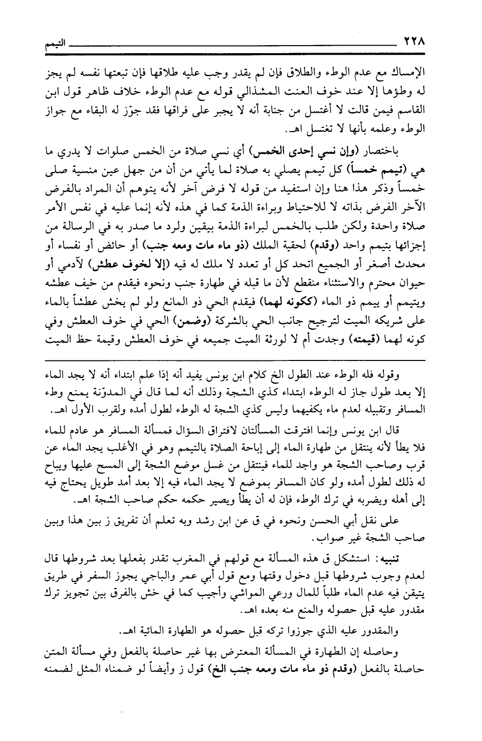 تنبيه: استشكل ق هذه المسألة مع قولهم في المغرب تقدر بفعلها بعد شروطها قال لعدم وجوب شروطها قبل دخول وقتها ومع قول أبي عمر والباجي يجوز السفر في طريق يتيقن فيه عدم الماء طلبًا للمال ورعي المواشي وأجيب كما في خش بالفرق بين تجويز ترك مقدور عليه قبل حصوله والمنع منه بعده اهـ.