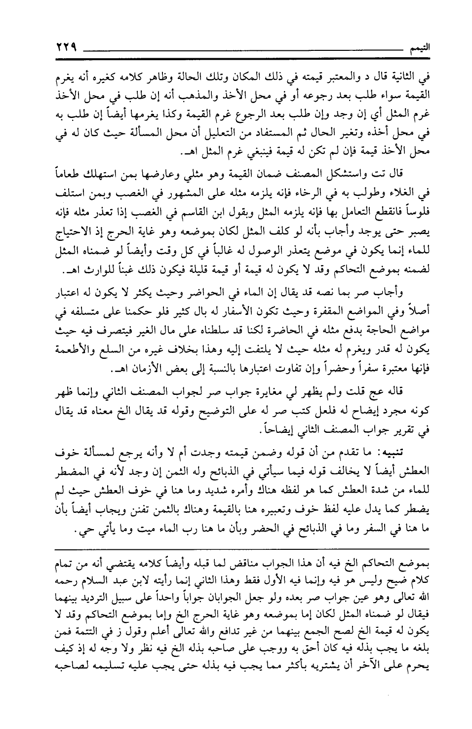 تنبيه: ما تقدم من أن قوله وضمن قيمته وجدت أم لا وأنه يرجع لمسألة خوف العطش أيضًا لا يخالف قوله فيما سيأتي في الذبائح وله الثمن إن وجد لأنه في المضطر للماء من شدة العطش كما هو لفظه هناك وأمره شديد وما هنا في خوف العطش حيث لم يضطر كما يدل عليه لفظ خوف وتعبيره هنا بالقيمة وهناك بالثمن تفنن ويجاب أيضًا بأن ما هنا في السفر وما في الذبائح في الحضر وبأن ما هنا رب الماء ميت وما يأتي حي.