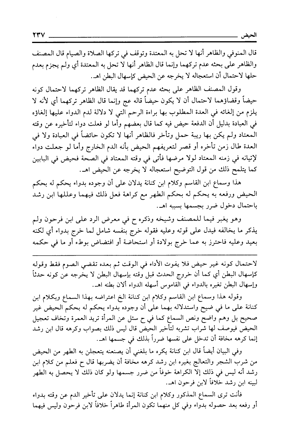 فأنت ترى السماع المذكور وكلام ابن كنانة إنما يدلان على تأخير الدم عن وقته بدواء أو رفعه بعد حصوله بدواء وفي كل منهما تكون المرأة طاهرًا خلافًا لابن فرحون وليس فيهما