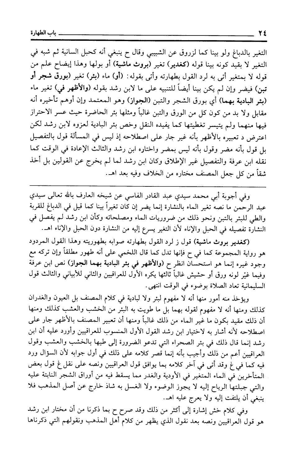 وفي أجوبة أبي محمَّد سيدي عبد القادر الفاسي عن شيخه العارف بالله تعالى سيدي عبد الرحمن ما نصه تغير الماء بالنشارة إنما يضر إن كان تغيرًا بينا كما قيل في الدباغ للقربة والطي للبئر بالتبن ونحو ذلك من ضروريات الماء ومصلحاته وكأن ابن رشد لم يفصل في النشارة تفصيله في الحبل والإناء لأن التغير يسرع إليه من النشارة دون الحبل والإناء اهـ.