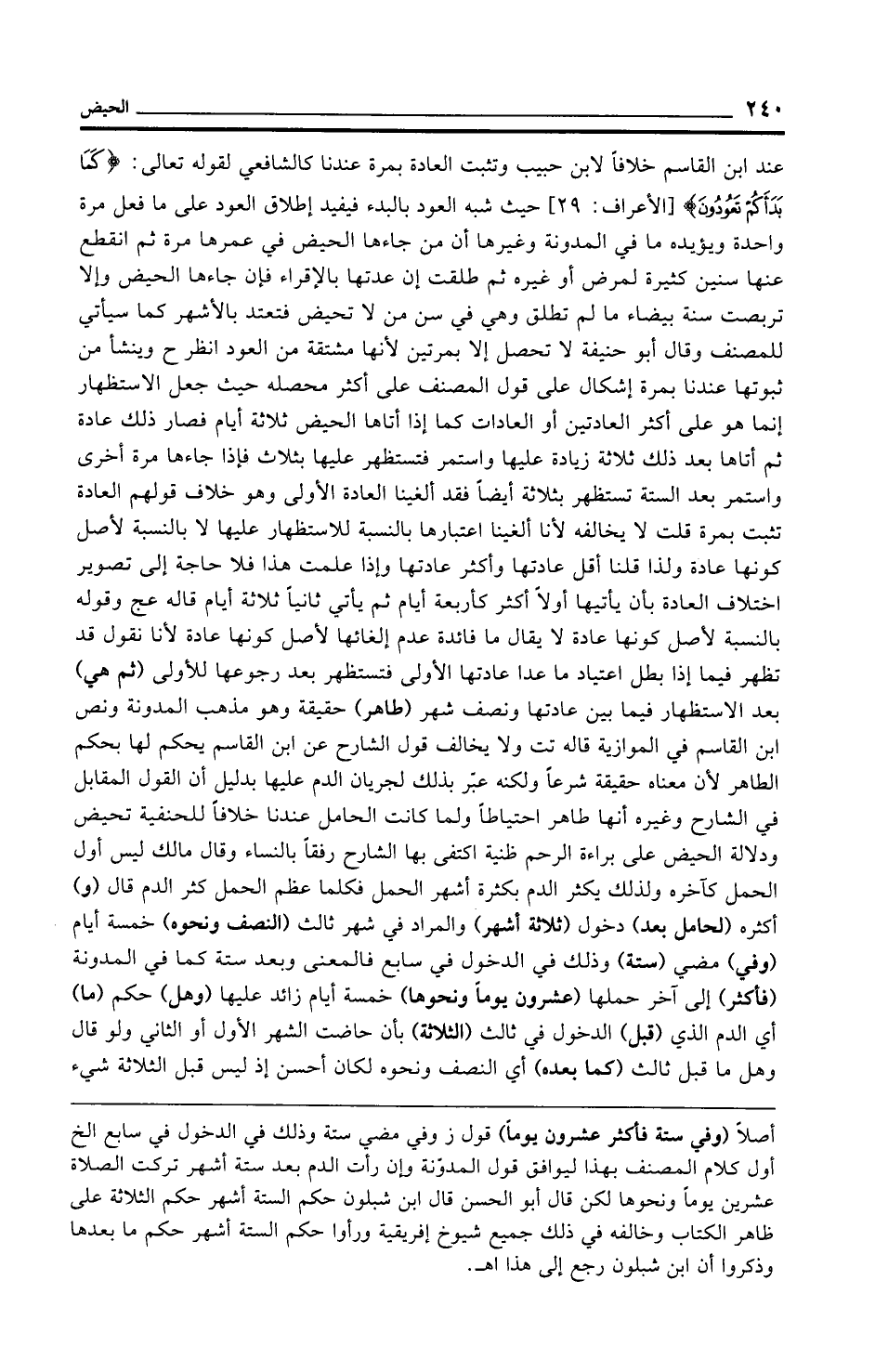 عند ابن القاسم خلافًا لابن حبيب وتثبت العادة بمرة عندنا كالشافعي لقوله تعالى: {كَمَا بَدَأَكُمْ تَعُودُونَ} [الأعراف: 29] حيث شبه العود بالبدء فيفيد إطلاق العود على ما فعل مرة واحدة ويؤيده ما في المدونة وغيرها أن من جاءها الحيض في عمرها مرة ثم انقطع عنها سنين كثيرة لمرض أو غيره ثم طلقت إن عدتها بالإقراء فإن جاءها الحيض وإلا تربصت سنة بيضاء ما لم تطلق وهي في سن من لا تحيض فتعتد بالأشهر كما سيأتي للمصنف وقال أبو حنيفة لا تحصل إلا بمرتين لأنها مشتقة من العود انظر ح وينشأ من ثبوتها عندنا بمرة إشكال على قول المصنف على أكثر محصله حيث جعل الاستظهار إنما هو على أكثر العادتين أو العادات كما إذا أتاها الحيض ثلاثة أيام فصار ذلك عادة ثم أتاها بعد ذلك ثلاثة زيادة عليها واستمر فتستظهر عليها بثلاث فإذا جاءها مرة أخرى واستمر بعد الستة تستظهر بثلاثة أيضًا فقد ألغينا العادة الأولى وهو خلاف قولهم العادة تثبت بمرة قلت لا يخالفه لأنا ألغينا اعتبارها بالنسبة للاستظهار عليها لا بالنسبة لأصل كونها عادة ولذا قلنا أقل عادتها وأكثر عادتها وإذا علمت هذا فلا حاجة إلى تصوير اختلاف العادة بأن يأتيها أولًا أكثر كأربعة أيام ثم يأتي ثانيًا ثلاثة أيام قاله عج وقوله بالنسبة لأصل كونها عادة لا يقال ما فائدة عدم إلغائها لأصل كونها عادة لأنا نقول قد تظهر فيما إذا بطل اعتياد ما عدا عادتها الأولى فتستظهر بعد رجوعها للأولى (ثم هي) بعد الاستظهار فيما بين عادتها ونصف شهر (طاهر) حقيقة وهو مذهب المدونة ونص ابن القاسم في الموازية قاله تت ولا يخالف قول الشارح عن ابن القاسم يحكم لها بحكم الطاهر لأن معناه حقيقة شرعًا ولكنه عبّر بذلك لجريان الدم عليها بدليل أن القول المقابل في الشارح وغيره أنها طاهر احتياطًا ولما كانت الحامل عندنا خلافًا للحنفية تحيض ودلالة الحيض على براءة الرحم ظنية اكتفى بها الشارح رفقًا بالنساء وقال مالك ليس أول الحمل كآخره ولذلك يكثر الدم بكثرة أشهر الحمل فكلما عظم الحمل أكثر الدم قال (و) أكثره (لحامل بعد) دخول (ثلاثة أشهر) والمراد في شهر ثالث (النصف ونحوه) خمسة أيام (في) مضي (ستة) وذلك في الدخول في سابع فالمعنى وبعد ستة كما في المدونة (فأكثر) إلى آخر حملها (عشرون يومًا ونحوها) خمسة أيام زائد عليها (وهل) حكم (ما) أي الدم الذي (قبل) الدخول في ثالث (الثلاثة) بأن حاضت الشهر الأول أو الثاني ولو قال وهل ما قبل ثالث (كما بعده) أي النصف ونحوه لكان أحسن إذ ليس قبل الثلاثة شيء