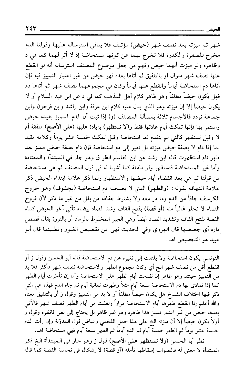 شهر ثم ميزته بعد نصف شهر (حيض) مؤتنف فلا ينافي استرساله عليها وقولنا الدم مخرج للصفرة والكدرة فلا تخرج بهما عن كونها مستحاضة إذ لا أثر لهما كما في د وظاهره ولو ميزت أنهما حيض وفهم من جعل موضوع المصنف استرساله أنه لو انقطع عنها نصف شهر متوال أو بالتلفيق ثم أتاها بعده فهو حيض من غير اعتبار التمييز فيه فإن أتاها دم استحاضة أيامًا وانقطع عنها أيامًا وكان في مجموعهما نصف شهر ثم أتاها دم فهل يكون حيضًا مطلقًا وهو ظاهر كلام أهل المذهب كما في د عن ابن عبد السلام أو لا يكون حيضًا إلا إن ميزته وهو الذي يدل عليه كلام ابن عرفة وابن راشد وابن فرحون وابن جماعة تردد فالأجسام ثلاثة بمسألة المصنف (و) إذا ثبت أن الدم المميز بقيده حيض واستمر بها فإنها تمكث أيام عادتها فقط و (لا تستظهر) بزيادة عليها (على الأصح) ملفقة أم لا وقيل تستظهر كالتي لم يتقدم لها استحاضة وقيل تمكث خمسة عشر يومًا وكلامه مقيد بما إذا دام لا بصفة حيض ميزته بل تغير إلى دم استحاضة فإن دام بصفة حيض مميز بعد طهر تام استظهرت قاله ابن رشد عن ابن القاسم انظر ق وهو جار في المبتدأة والمعتادة وأما غير المستحاضة فتستظهر ولو ملفقة كما أشرنا له في قول المصنف ثم هي مستحاضة من قولنا ثم هي بعد انقضاء أيام حيضها والاستظهار ولما ذكر علامة ابتداء الحيض ذكر علامة انتهائه بقوله: (والطهر) الذي لا يصحبه دم استحاضة (بجفوف) وهو خروج الكرسف جافًّا من الدم وما مر معه ولا يشترط جفافه من بلل من غير ما ذكر لأن فروج النساء لا تخلو غالبًا منه (أو قصة) بفتح القاف وشد الصاد بيضاء تأتي آخر الحيض كماء القصة بفتح القاف وتشديد الصاد أيضًا وهي الجير المخلوط بالرماد أو بالنورة يقال قصص داره أي جصصها قال الهروي وفي الحديث نهى عن تقصيص القبور وتطيينها قال أبو عبيد هو التجصيص اهـ.