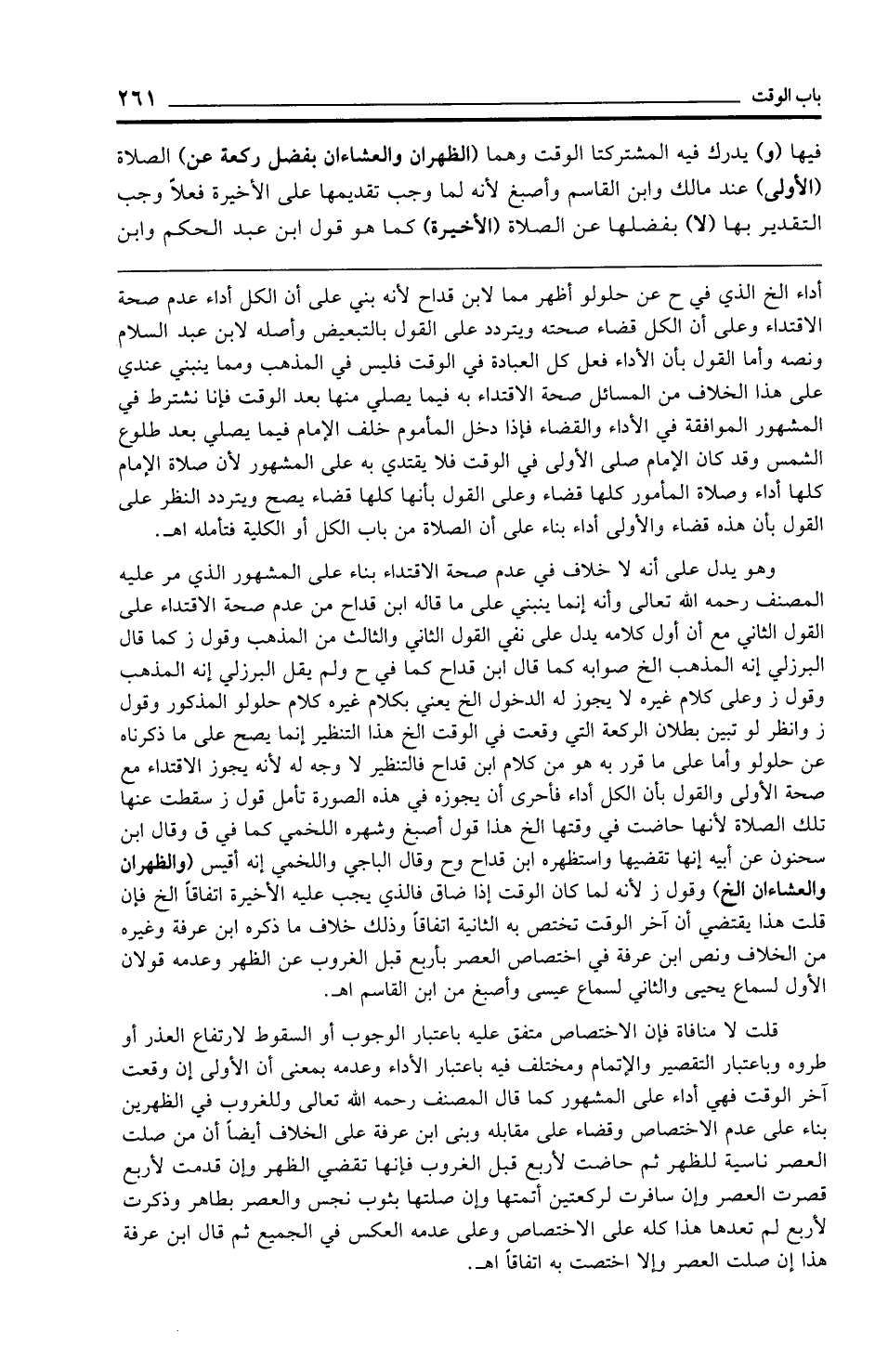فيها (و) يدرك فيه المشتركتا الوقت وهما (الظهران والعشاءان بفضل ركعة عن) الصلاة (الأولى) عند مالك وابن القاسم وأصبغ لأنه لما وجب تقديمها على الأخيرة فعلًا وجب التقدير بها (لا) بفضلها عن الصلاة (الأخيرة) كما هو قول ابن عبد الحكم وابن