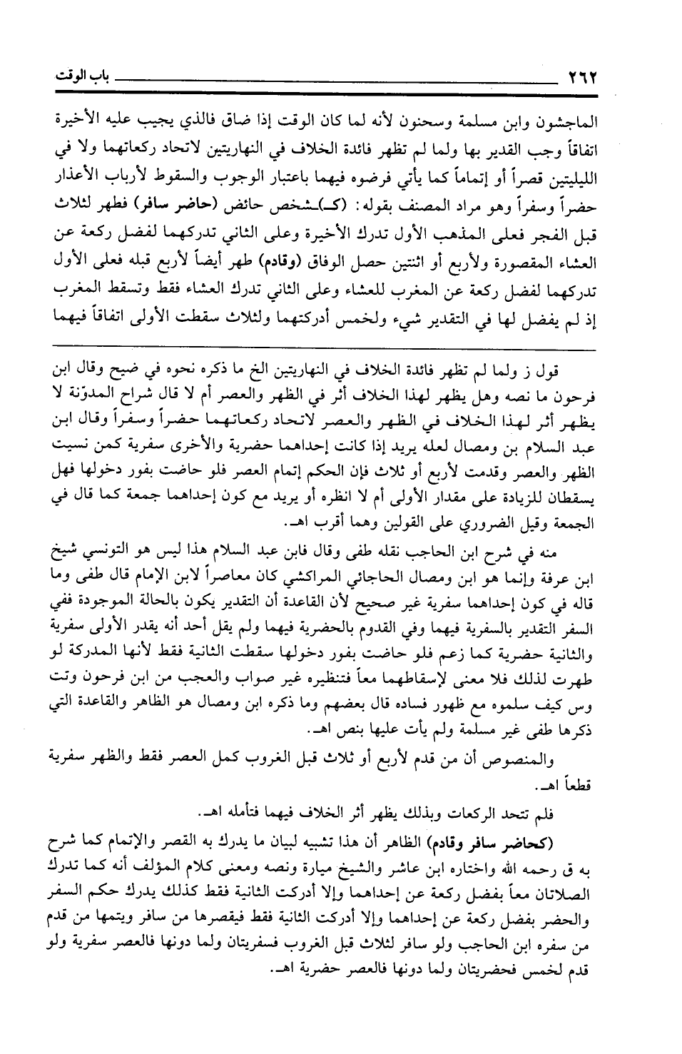 منه في شرح ابن الحاجب نقله طفى وقال فابن عبد السلام هذا ليس هو التونسي شيخ ابن عرفة وإنما هو ابن ومصال الحاجائي المراكشي كان معاصرًا لابن الإِمام قال طفى وما قاله في كون إحداهما سفرية غير صحيح لأن القاعدة أن التقدير يكون بالحالة الموجودة ففي السفر التقدير بالسفرية فيهما وفي القدوم بالحضرية فيهما ولم يقل أحد أنه يقدر الأولى سفرية والثانية حضرية كما زعم فلو حاضت بفور دخولها سقطت الثانية فقط لأنها المدركة لو طهرت لذلك فلا معنى لإسقاطهما معًا فتنظيره غير صواب والعجب من ابن فرحون وقت وس كيف سلموه مع ظهور فساده قال بعضهم وما ذكره ابن ومصال هو الظاهر والقاعدة التي ذكرها طفى غير مسلمة ولم يأت عليها بنص اهـ.