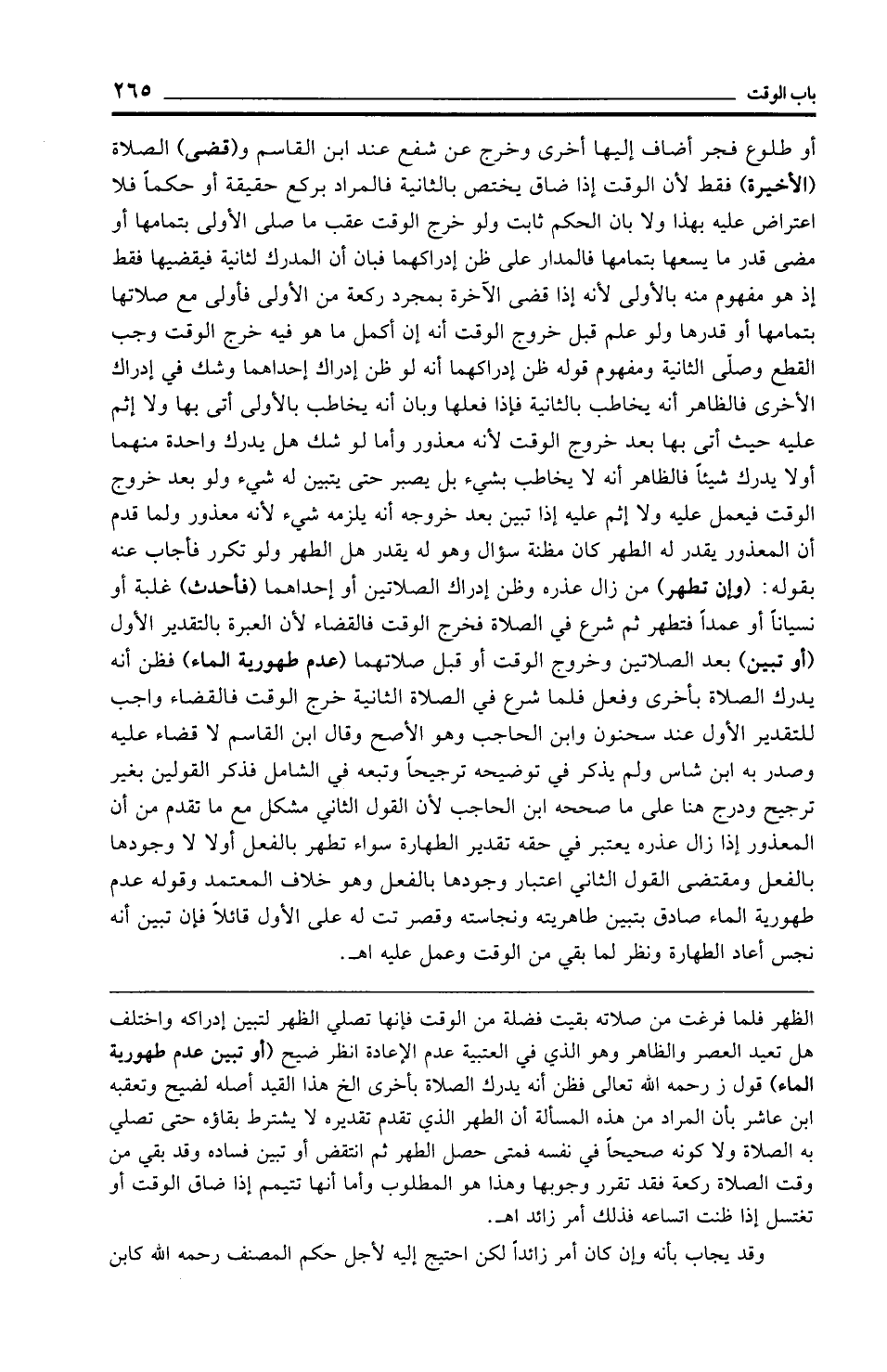 أو طلوع فجر أضاف إليها أخرى وخرج عن شفع عند ابن القاسم و (قضى) الصلاة (الأخيرة) فقط لأن الوقت إذا ضاق يختص بالثانية فالمراد بركع حقيقة أو حكمًا فلا اعتراض عليه بهذا ولا بأن الحكم ثابت ولو خرج الوقت عقب ما صلى الأولى بتمامها أو مضى قدر ما يسعها بتمامها فالمدار على ظن إدراكهما فبان أن المدرك لثانية فيقضيها فقط إذ هو مفهوم منه بالأولى لأنه إذا قضى الآخرة بمجرد ركعة من الأولى فأولى مع صلاتها بتمامها أو قدرها ولو علم قبل خروج الوقت أنه إن أكمل ما هو فيه خرج الوقت وجب القطع وصلى الثانية ومفهوم قوله ظن إدراكهما أنه لو ظن إدراك إحداهما وشك في إدراك الأخرى فالظاهر أنه يخاطب بالثانية فإذا فعلها وبأن أنه يخاطب بالأولى أتى بها ولا إثم عليه حيث أتى بها بعد خروج الوقت لأنه معذور وأما لو شك هل يدرك واحدة منهما أولًا يدرك شيئًا فالظاهر أنه لا يخاطب بشيء بل يصبر حتى يتبين له شيء ولو بعد خروج الوقت فيعمل عليه ولا إثم عليه إذا تبين بعد خروجه أنه يلزمه شيء لأنه معذور ولما قدم أن المعذور يقدر له الطهر كان مظنة سؤال وهو له يقدر هل الطهر ولو تكرر فأجاب عنه بقوله: (وإن تطهر) من زال عذره وظن إدراك الصلاتين أو إحداهما (فأحدث) غلبة أو نسيانًا أو عمدًا فتطهر ثم شرع في الصلاة فخرج الوقت فالقضاء لأن العبرة بالتقدير الأول (أو تبين) بعد الصلاتين وخروج الوقت أو قبل صلاتهما (عدم طهورية الماء) فظن أنه يدرك الصلاة بأخرى وفعل فلما شرع في الصلاة الثانية خرج الوقت فالقضاء واجب للتقدير الأول عند سحنون وابن الحاجب وهو الأصح وقال ابن القاسم لا قضاء عليه وصدر به ابن شاس ولم يذكر في توضيحه ترجيحًا وتبعه في الشامل فذكر القولين بغير ترجيح ودرج هنا على ما صححه ابن الحاجب لأن القول الثاني مشكل مع ما تقدم من أن المعذور إذا زال عذره يعتبر في حقه تقدير الطهارة سواء تطهر بالفعل أولًا لا وجودها بالفعل ومقتضى القول الثاني اعتبار وجودها بالفعل وهو خلاف المعتمد وقوله عدم طهورية الماء صادق بتبين طاهريته ونجاسته وقصر تت له على الأول قائلًا فإن تبين أنه نجس أعاد الطهارة ونظر لما بقي من الوقت وعمل عليه اهـ.