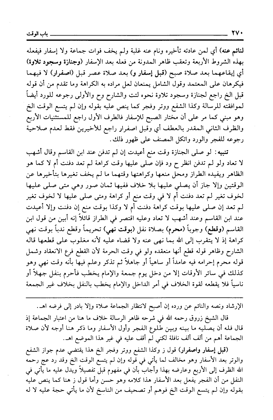 قال الشيخ زروق رحمه الله في شرحه ظاهر الرسالة خلاف ما هنا من اعتبار الجماعة إذ قال فله أن يصليه ما بينه وبين طلوع الفجر وأول الأسفار وما ذكر هنا أوجه لأن صلاة الجماعة أهم من ألف ألف نافلة لكني لم أقف عليه في غير هذا الموضع اهـ.