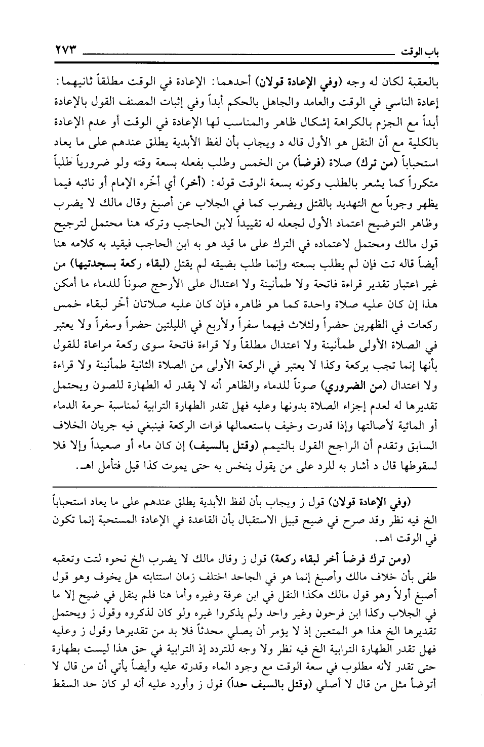 بالعقبة لكان له وجه (وفي الإعادة قولان) أحدهما: الإعادة في الوقت مطلقًا ثانيهما: إعادة الناسي في الوقت والعامد والجاهل بالحكم أبدًا وفي إثبات المصنف القول بالإعادة أبدًا مع الجزم بالكراهة إشكال ظاهر والمناسب لها الإعادة في الوقت أو عدم الإعادة بالكلية مع أن النقل هو الأول قاله د ويجاب بأن لفظ الأبدية يطلق عندهم على ما يعاد استحبابًا (من ترك) صلاة (فرضًا) من الخمس وطلب بفعله بسعة وقته ولو ضروريًّا طلبًا متكررًا كما يشعر بالطلب وكونه بسعة الوقت قوله: (أخر) أي أخّره الإِمام أو نائبه فيما يظهر وجوبًا مع التهديد بالقتل ويضرب كما في الجلاب عن أصبغ وقال مالك لا يضرب وظاهر التوضيح اعتماد الأول لجعله له تقييدًا لابن الحاجب وتركه هنا محتمل لترجيح قول مالك ومحتمل لاعتماده في الترك على ما قيد هو به ابن الحاجب فيقيد به كلامه هنا أيضًا قاله تت فإن لم يطلب بسعته وإنما طلب بضيقه لم يقتل (لبقاء ركعة بسجدتيها) من غير اعتبار تقدير قراءة فاتحة ولا طمأنينة ولا اعتدال على الأرحج صونًا للدماء ما أمكن هذا إن كان عليه صلاة واحدة كما هو ظاهره فإن كان عليه صلاتان أخّر لبقاء خمس ركعات في الظهرين حضرًا ولثلاث فيهما سفرًا ولأربع في الليلتين حضرًا وسفرًا ولا يعتبر في الصلاة الأولى طمأنينة ولا اعتدال مطلقًا ولا قراءة فاتحة سوى ركعة مراعاة للقول بأنها إنما تجب بركعة وكذا لا يعتبر في الركعة الأولى من الصلاة الثانية طمأنينة ولا قراءة ولا اعتقال (من الضروري) صونًا للدماء والظاهر أنه لا يقدر له الطهارة للصون ويحتمل تقديرها له لعدم إجزاء الصلاة بدونها وعليه فهل تقدر الطهارة الترابية لمناسبة حرمة الدماء أو المائية لأصالتها وإذا قدرت وخيف باستعمالها فوات الركعة فينبغي فيه جريان الخلاف السابق وتقدم أن الراجح القول بالتيمم (وقتل بالسيف) إن كان ماء أو صعيدًا وإلا فلا لسقوطها قال د أشار به للرد على من يقول ينخس به حتى يموت كذا قيل فتأمل اهـ.