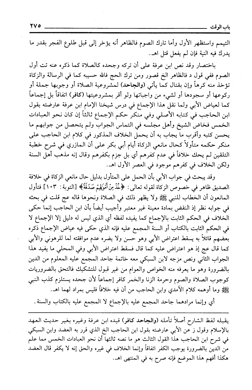 وقد يبحث في جواب الأبي بأن الحمل على المتأول بدليل حال مانعي الزكاة في خلافة الصديق ظاهر في خصوص الزكاة لقوله تعالى: {خُذْ مِنْ أَمْوَالِهِمْ صَدَقَةً} [التوبة: 103] فتأول المانعون أن الخطاب للنبي - صلى الله عليه وسلم - ولا يظهر ذلك في الصلاة ونحوها قاله عج قلت في بحثه في جوابه نظر إذ النقض بمادة معينة غير معتبر وأجيب أيضًا بأن ابن الحاجب إنما حكى الخلاف في الحكم الثابت بالإجماع كما يفيده لفظه أي الذي ليس له دليل إلا الإجماع لا في الحكم الثابت بالكتاب أو السنة, المجمع عليه فإنه الذي حكى فيه عياض الإجماع ذكره بعضهم قائلًا به يسقط اعتراض الأبي وهو حسن ولا يضره عدم موافقته لما للرهوني والأبي كما قال عج إذ هو اعتراض عليه كما قال فسقط اعتراض الأبي وفي المحلي ما يفيد هذا الجواب الثاني ونص مزجه لابن السبكي معه خاتمة جاحد المجمع عليه المعلوم من الدين بالضرورة وهو ما يعرفه منه الخواص والعوام من غير قبول للتشكيك فالتحق بالضروريات كوجوب الصلاة والصوم وحرمة الزنا والخمر كافر إجماعًا لأن جحده يستلزم كذب النبي - صلى الله عليه وسلم - وما أوهمه كلام الآمدي وابن الحاجب من أن فيه خلافًا فليس بمراد لهما اهـ.