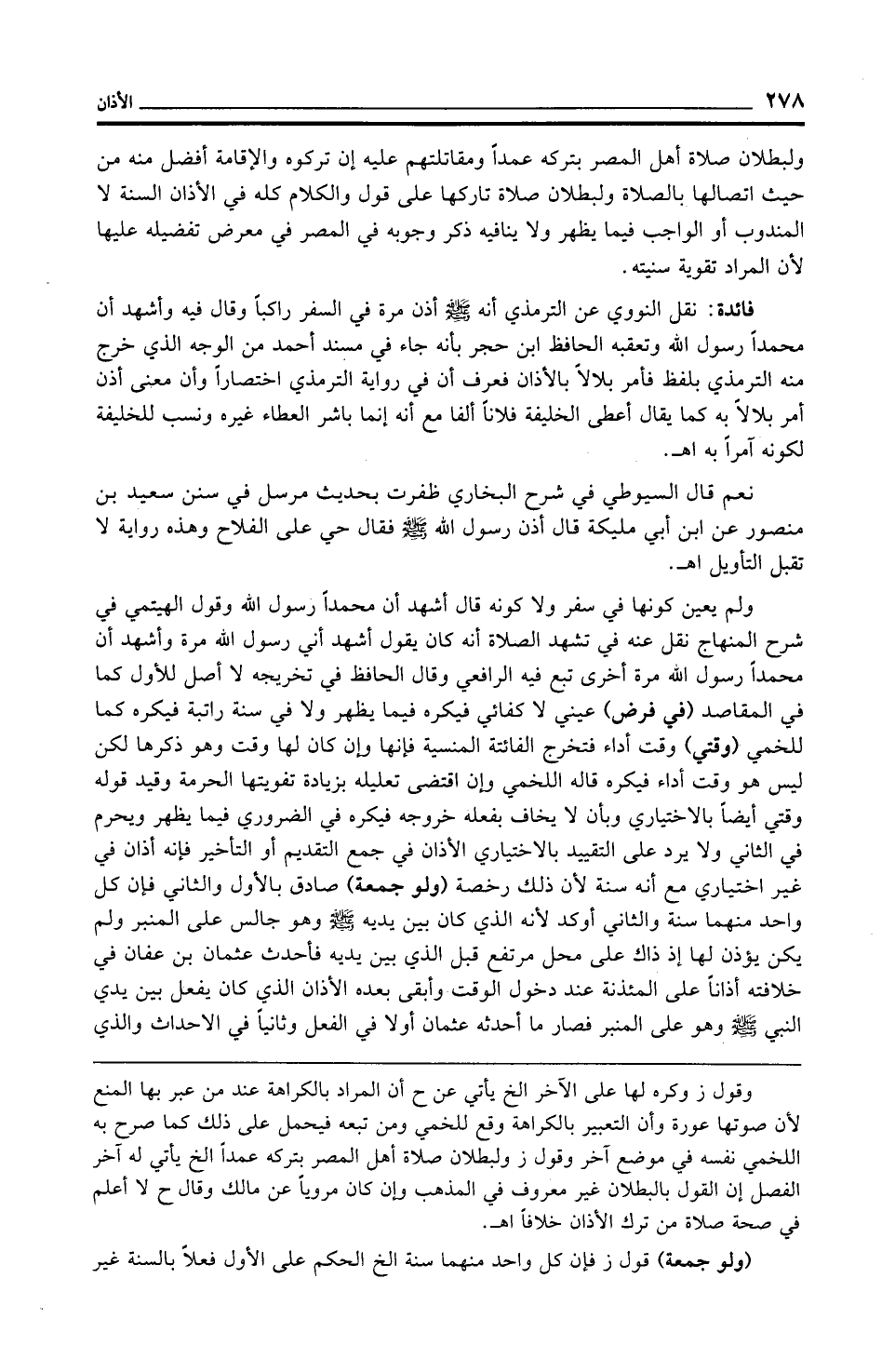 فائدة: نقل النووي عن الترمذي أنه - صلى الله عليه وسلم - أذن مرة في السفر راكبًا وقال فيه وأشهد أن محمدًا رسول الله وتعقبه الحافظ ابن حجر بأنه جاء في مسند أحمد من الوجه الذي خرج منه الترمذي بلفظ فأمر بلالًا بالأذان فعرف أن في رواية الترمذي اختصارًا وأن معنى أذن أمر بلالًا به كما يقال أعطى الخليفة فلانًا ألفا مع أنه إنما باشر العطاء غيره ونسب للخليفة لكونه آمرًا به اهـ.