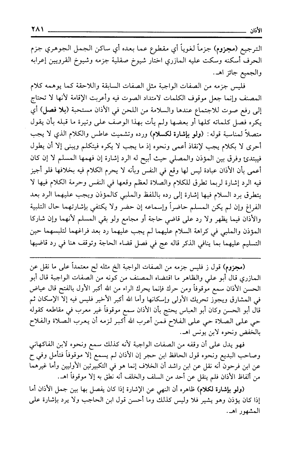 فليس جزمه من الصفات الواجبة مثل الصفات السابقة واللاحقة كما يوهمه كلام المصنف وإنما جعل موقوف الكلمات لامتداد الصوت فيه وأعربت الإقامة لأنها لا تحتاج إلى رفع صوت للاجتماع عندها والسلامة من اللحن في الأذان مستحبة (بلا فصل) أي يكره فصل كلماته كلها أو بعضها ولم يأت بهذا الوصف على وتيرة ما قبله بأن يقول متصلًا لمناسبة قوله: (ولو بإشارة لكسلام) ورده وتشميت عاطس والكلام الذي لا يجب أحرى لا بكلام يجب لإنقاذ أعمى ونحوه إذ ما يجب لا يكره فيتكلم ويبنى إلا أن يطول فيبتدئ وفرق بين المؤذن والمصلي حيث أبيح له الرد إشارة إن فهمها المسلم لا إن كان أعمى بأن الأذان عبادة ليس لها وقع في النفس وبأنه لا يحرم الكلام فيه بخلافها فلو أجيز فيه الرد إشارة لربما تطرق للكلام والصلاة لعظم وقعها في النفس وحرمة الكلام فيها لا يتطرق برد السلام فيها إشارة إلى رده باللفظ والملبي كالمؤذن ويجب عليهما الرد بعد الفراغ وإن لم يكن المسلم حاضرًا وإسماعه إن حضر ولا يكتفي بإشارتهما حال التلبية والأذان فيما يظهر ولا رد على قاضي حاجة أو مجامع ولو بقي المسلم لأنهما وإن شاركا المؤذن والملبي في كراهة السلام عليهما لم يجب عليهما رد بعد فراغهما لتلبسهما حين التسليم عليهما بما ينافي الذكر قاله عج في فصل قضاء الحاجة وتوقف هنا في رد قاضيها