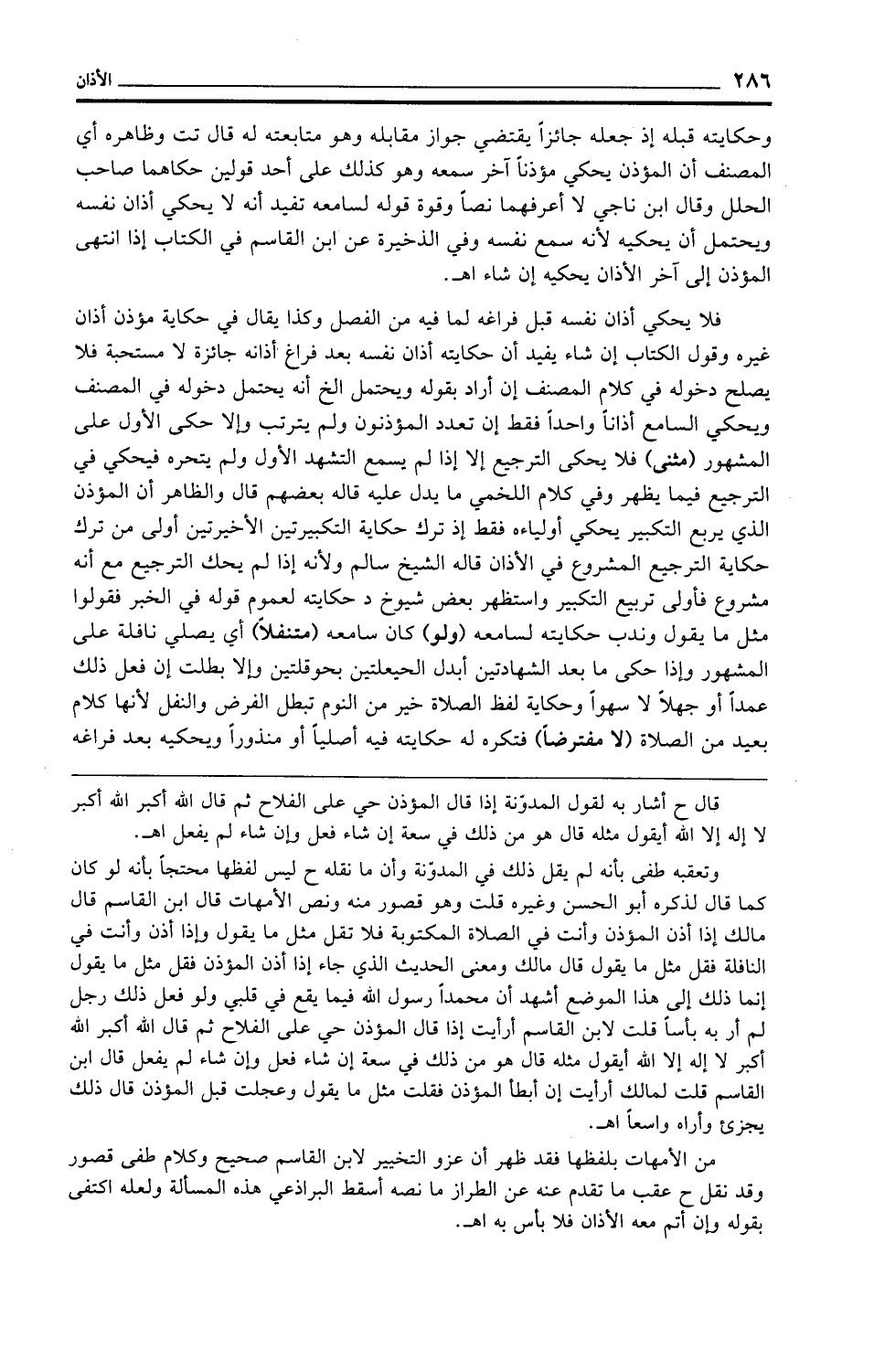 وتعقبه طفى بأنه لم يقل ذلك في المدوّنة وأن ما نقله ح ليس لفظها محتجًا بأنه لو كان كما قال لذكره أبو الحسن وغيره قلت وهو قصور منه ونص الأمهات قال ابن القاسم قال مالك إذا أذن المؤذن وأنت في الصلاة المكتوبة فلا تقل مثل ما يقول وإذا أذن وأنت في النافلة فقل مثل ما يقول قال مالك ومعنى الحديث الذي جاء إذا أذن المؤذن فقل مثل ما يقول إنما ذلك إلى هذا الموضع أشهد أن محمدًا رسول الله فيما يقع في قلبي ولو فعل ذلك رجل لم أر به بأسًا قلت لابن القاسم أرأيت إذا قال المؤذن حي على الفلاح ثم قال الله أكبر الله أكبر لا إله إلا الله أيقول مثله قال هو من ذلك في سعة إن شاء فعل وإن شاء لم يفعل قال ابن القاسم قلت لمالك أرأيت إن أبطأ المؤذن فقلت مثل ما يقول وعجلت قبل المؤذن قال ذلك يجزئ وأراه واسعًا اهـ.