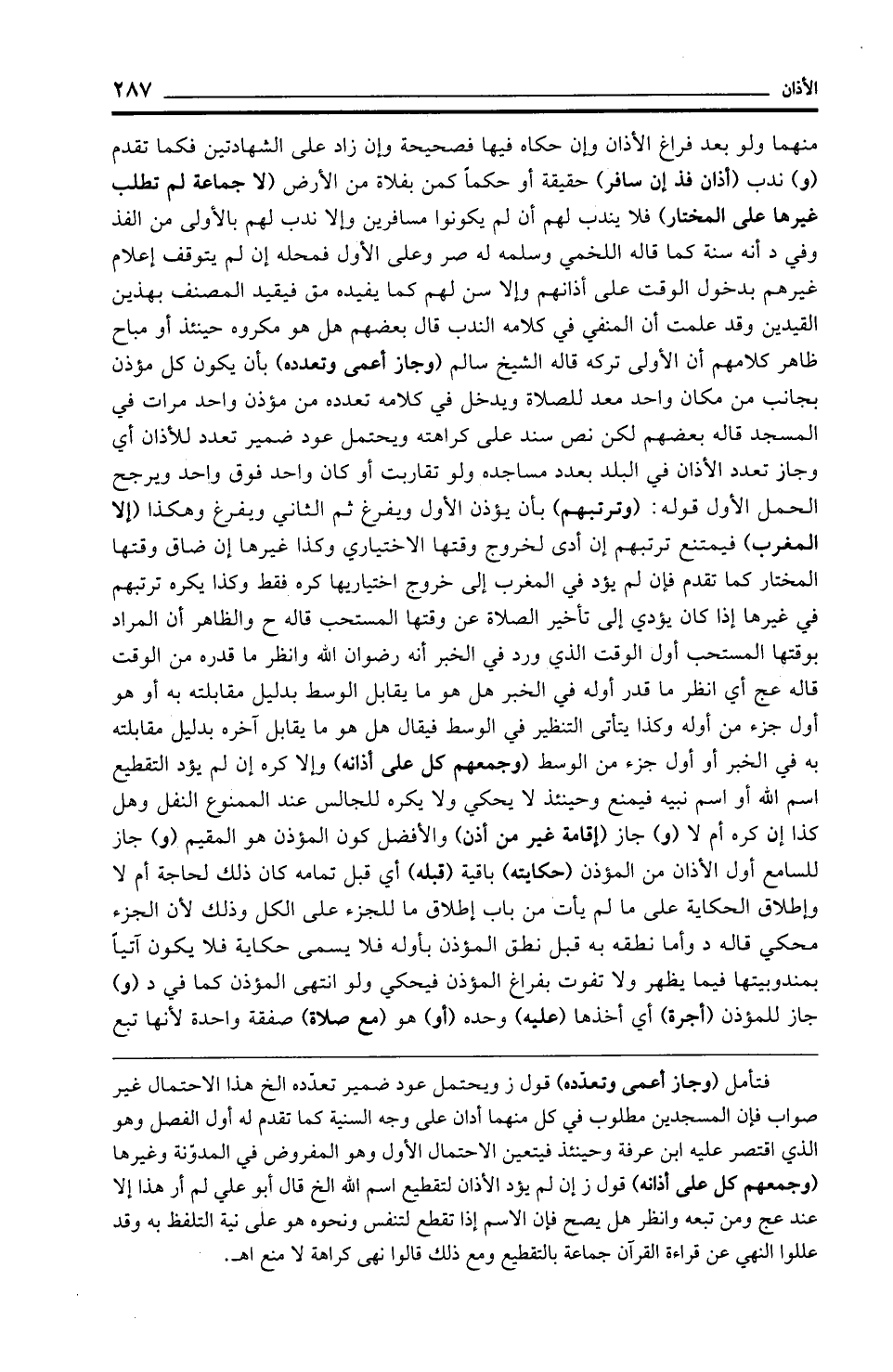منهما ولو بعد فراغ الأذان وإن حكاه فيها فصحيحة وإن زاد على الشهادتين فكما تقدم (و) ندب (أذان فذ إن سافر) حقيقة أو حكمًا كمن بفلاة من الأرض (لا جماعة لم تطلب غيرها على المختار) فلا يندب لهم أن لم يكونوا مسافرين وإلا ندب لهم بالأولى من الفذ وفي د أنه سنة كما قاله اللخمي وسلمه له صر وعلى الأول فمحله إن لم يتوقف إعلام غيرهم بدخول الوقت على أذانهم وإلا سن لهم كما يفيده مق فيقيد المصنف بهذين القيدين وقد علمت أن المنفي في كلامه الندب قال بعضهم هل هو مكروه حينئذ أو مباح ظاهر كلامهم أنا الأولى تركه قاله الشيخ سالم (وجاز أعمى وتعدده) بأن يكون كل مؤذن بجانب من مكان واحد معد للصلاة ويدخل في كلامه تعدده من مؤذن واحد مرات في المسجد قاله بعضهم لكن نص سند على كراهته ويحتمل عود ضمير تعدد للأذان أي وجاز تعدد الأذان في البلد بعدد مساجده ولو تقاربت أو كان واحد فوق واحد ويرجح الحمل الأول قوله: (وترتبهم) بأن يؤذن الأول ويفرغ ثم الثاني ويفرغ وهكذا (إلا المغرب) فيمتنع ترتبهم إن أدى لخروج وقتها الاختياري وكذا غيرها إن ضاق وقتها المختار كما تقدم فإن لم يؤد في المغرب إلى خروج اختياريها كره فقط وكذا يكره ترتبهم في غيرها إذا كان يؤدي إلى تأخير الصلاة عن وقتها المستحب قاله ح والظاهر أن المراد بوقتها المستحب أول الوقت الذي ورد في الخبر أنه رضوان الله وانظر ما قدره من الوقت قاله عج أي انظر ما قدر أوله في الخبر هل هو ما يقابل الوسط بدليل مقابلته به أو هو أول جزء من أوله وكذا يتأتى التنظير في الوسط فيقال هل هو ما يقابل آخره بدليل مقابلته به في الخبر أو أول جزء من الوسط (وجمعهم كل على أذانه) وإلا كره إن لم يؤد التقطيع اسم الله أو اسم نبيه فيمنع وحينئذ لا يحكي ولا يكره للجالس عند الممنوع النفل وهل كذا إن كره أم لا (و) جاز (إقامة غير من أذن) والأفضل كون المؤذن هو المقيم (و) جاز للسامع أول الأذان من المؤذن (حكايته) باقية (قبله) أي قبل تمامه كان ذلك لحاجة أم لا وإطلاق الحكاية على ما لم يأت من باب إطلاق ما للجزء على الكل وذلك لأن الجزء محكي قاله د وأما نطقه به قبل نطق المؤذن بأوله فلا يسمى حكاية فلا يكون آتيًا بمندوبيتها فيما يظهر ولا تفوت بفراغ المؤذن فيحكي ولو انتهى المؤذن كما في د (و) جاز للمؤذن (أجرة) أي أخذها (عليه) وحده (أو) هو (مع صلاة) صفقة واحدة لأنها تبع