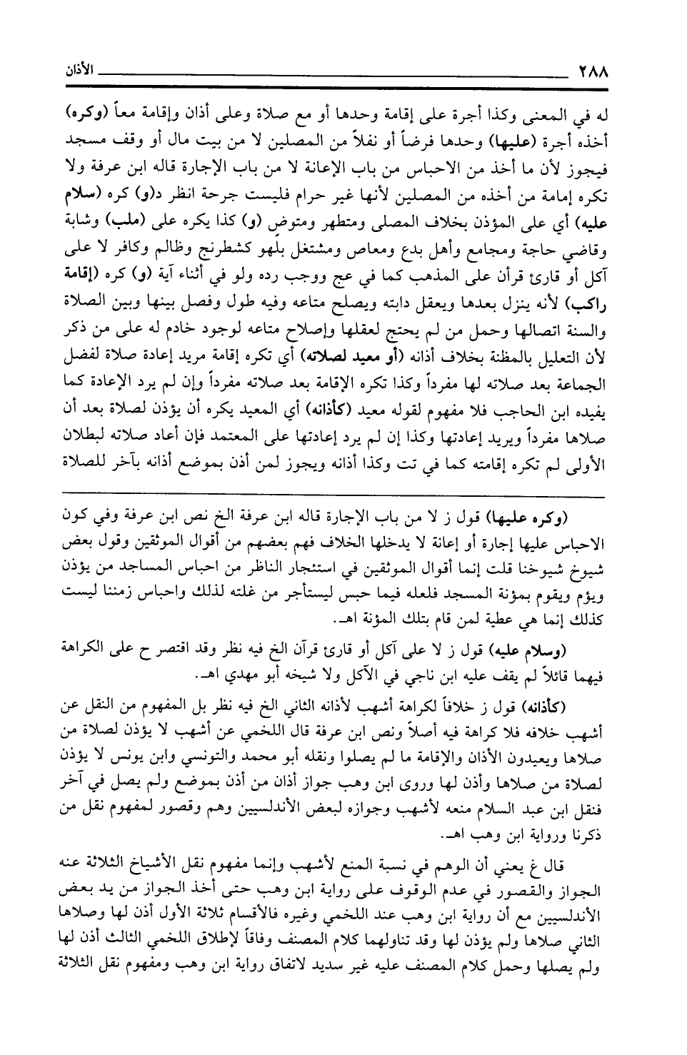له في المعنى وكذا أجرة على إقامة وحدها أو مع صلاة وعلى أذان وإقامة معًا (وكره) أخذه أجرة (عليها) وحدها فرضًا أو نفلًا من المصلين لا من بيت مال أو وقف مسجد فيجوز لأن ما أخذ من الإحباس من باب الإعانة لا من باب الإجارة قاله ابن عرفة ولا تكره إمامة من أخذه من المصلين لأنها غير حرام فليست جرحة انظر د (و) كره (سلام عليه) أي على المؤذن بخلاف المصلى ومتطهر ومتوضٍ (و) كذا يكره على (ملب) وشابة وقاضي حاجة ومجامع وأهل بدع ومعاص ومشتغل بلهو كشطرنج وظالم وكافر لا على آكل أو قارئ قرأن على المذهب كما في عج ووجب رده ولو في أثناء آية (و) كره (إقامة راكب) لأنه ينزل بعدها ويعقل دابته ويصلح متاعه وفيه طول وفصل بينها وبين الصلاة والسنة اتصالها وحمل من لم يحتج لعقلها وإصلاح متاعه لوجود خادم له على من ذكر لأن التعليل بالمظنة بخلاف أذانه (أو معيد لصلاته) أي تكره إقامة مريد إعادة صلاة لفضل الجماعة بعد صلاته لها مفردًا وكذا تكره الإقامة بعد صلاته مفردًا وإن لم يرد الإعادة كما يفيده ابن الحاجب فلا مفهوم لقوله معيد (كأذانه) أي المعيد يكره أن يؤذن لصلاة بعد أن صلاها مفردًا ويريد إعادتها وكذا إن لم يرد إعادتها على المعتمد فإن أعاد صلاته لبطلان الأولى لم تكره إقامته كما في تت وكذا أذانه ويجوز لمن أذن بموضع أذانه بآخر للصلاة