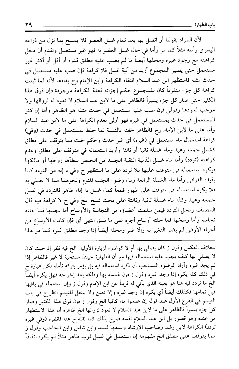 بخلاف العكس وقول ز كان يصلي بها أم لا كوضوء لزيارة الأولياء الخ فيه نظر إذ حيث كان لا يصلي بها كيف يجب عليه استعماله فيها مع أن الطهارة حينئذ مستحبة لا غير فالظاهر إذا لم يجد غيره وأراد الوضوء المستحب أن يكره استعماله فيه بل يؤمر بتركه تأمله لكن عبارة ح في ذلك كله يكره إذا وجد غيره وقول ز فإن غمسه بها ودلكه بعد إخراجه فهل يكره أيضًا الخ ما تردد فيه هنا هو بعينه الذي يأتي له قريبًا عن ابن الإمام وقول ز وإن استعمله في باقيها قبل تمامها فكذلك أيضًا أي يكره إن وجد غيره وإلا تعين ولا ينتقل للتيمم انظر ح في باب التيمم في الفرع الأول عند قوله إن عدموا ماء كافيًا الخ وقول ز فإن فرق هذا الكثير وصار كل جزء يسيرًا فالظاهر على ما لابن عبد السلام لا تعود لزوالها الخ ظاهره أن هذا الاستظهار من عنده وهو قصور بل ابن عبد السلام نفسه صرح بذلك كما نقله ح عنه فانظره (وفي غيره تردد) الكراهة لابن رشد وصاحب الإرشاد وعدمها لسند وابن شاس وابن الحاجب وقول ز مما يتوقف على مطلق الخ مفهومه إن استعمل في غسل ثوب طاهر مثلًا لم يكره اتفاقًا