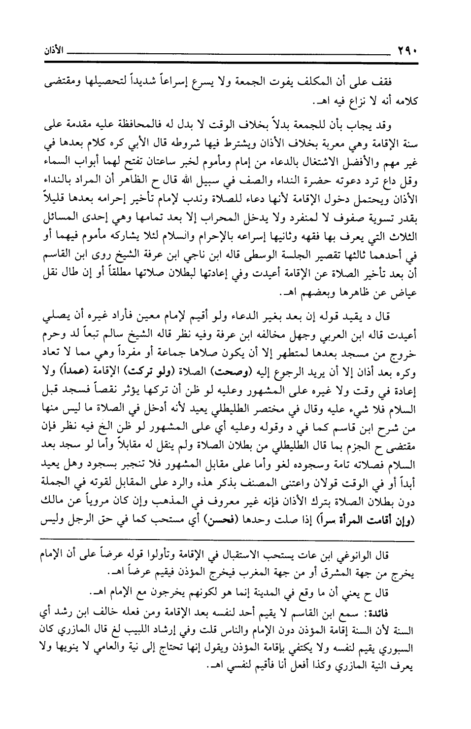 وقد يجاب بأن للجمعة بدلًا بخلاف الوقت لا بدل له فالمحافظة عليه مقدمة على سنة الإقامة وهي معربة بخلاف الأذان ويشترط فيها شروطه قال الأبي كره كلام بعدها في غير مهم والأفضل الاشتغال بالدعاء من إمام ومأموم لخبر ساعتان تفتح لهما أبواب السماء وقيل داع ترد دعوته حضرة النداء والصف في سبيل الله قال ح الظاهر أن المراد بالنداء الأذان ويحتمل دخول الإقامة لأنها دعاء للصلاة وندب لإمام تأخير إحرامه بعدها قليلًا بقدر تسوية صفوف لا لمنفرد ولا يدخل المحراب إلا بعد تمامها وهي إحدى المسائل الثلاث التي يعرف بها فقهه وثانيها إسراعه بالإحرام والسلام لئلا يشاركه مأموم فيهما أو في أحدهما ثالثها تقصير الجلسة الوسطى قاله ابن ناجي ابن عرفة الشيخ روى ابن القاسم أن بعد تأخير الصلاة عن الإقامة أعيدت وفي إعادتها لبطلان صلاتها مطلقًا أو إن طال نقل عياض عن ظاهرها وبعضهم اهـ.