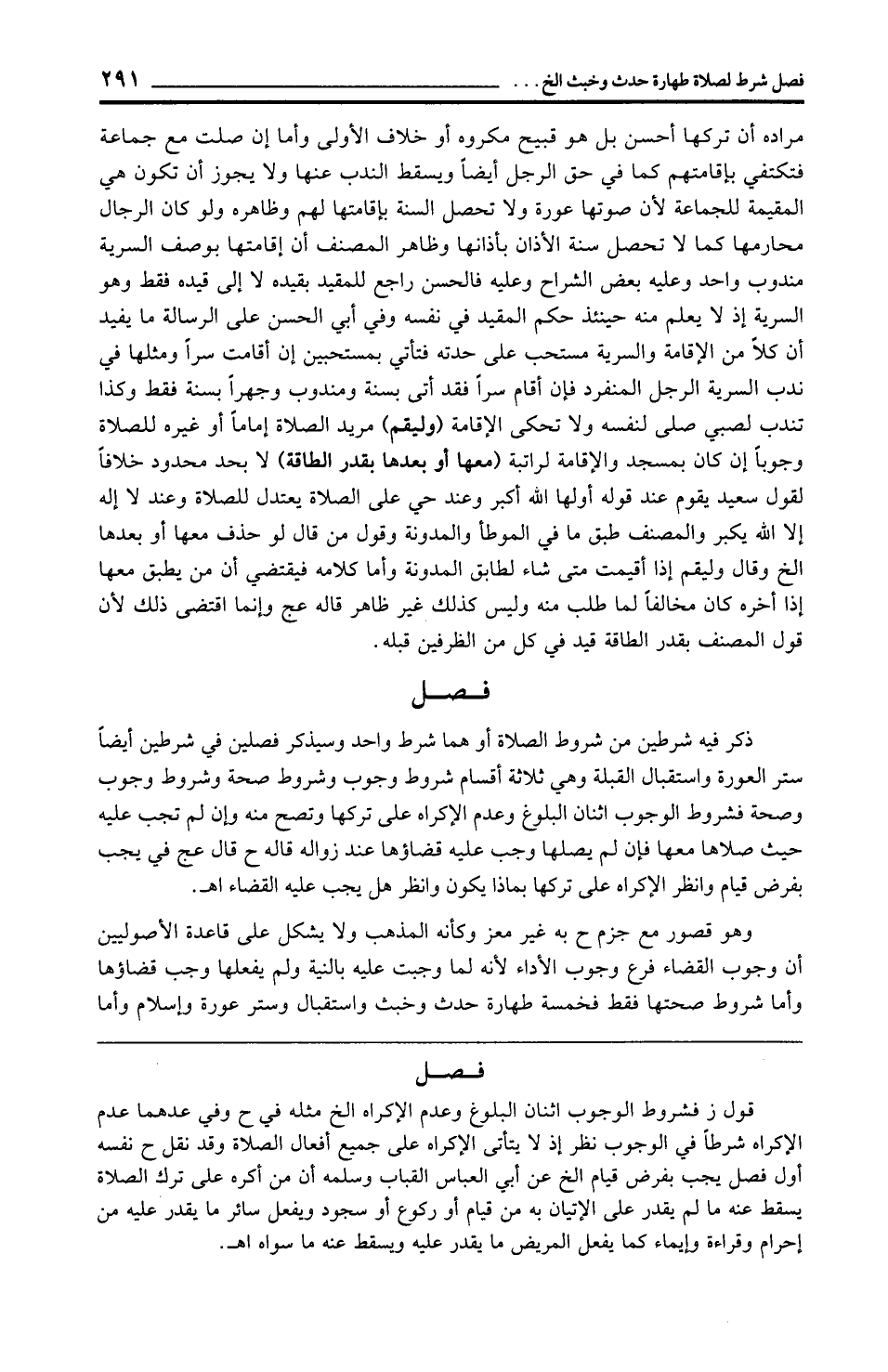ذكر فيه شرطين من شروط الصلاة أو هما شرط واحد وسيذكر فصلين في شرطين أيضًا ستر العورة واستقبال القبلة وهي ثلاثة أقسام شروط وجوب وشروط صحة وشروط وجوب وصحة فشروط الوجوب اثنان البلوغ وعدم الإكراه على تركها وتصح منه وإن لم تجب عليه حيث صلاها معها فإن لم يصلها وجب عليه قضاؤها عند زواله قاله ح قال عج في يجب بفرض قيام وانظر الإكراه على تركها بماذا يكون وانظر هل يجب عليه القضاء اهـ.