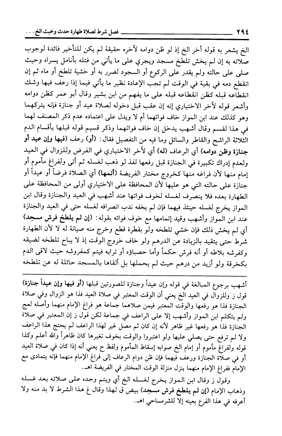 الخ يشعر به قوله أخر الخ إذ لو ظن دوامه لآخره حقيقة لم يكن للتأخير فائدة لوجوب صلاته به إن لم يخش تلطخ مسجد ويجري على ما يأتي من قتله بأنامل يسراه وحيث صلى على حالته ولم يقدر على الركوع أو السجود لضرر به أو خشية تلطخ أو ماء ثم إن انقطع دمه في بقية في الوقت لم تجب الإعادة نظير ما يأتي فيما إذا رعف فيها وشك انقطاعه قبه كظن انقطاعه قبله على ما يفهم من ابن بشير وقال أبو عمر كظن دوامه وأشعر قوله لآخر الاختياري إنه إن عقب قبل دخوله لصلاة عيد أو جنازة فإنه يتركهما وهو كذلك عند ابن المواز خاف فواتهما أم لا ويدل على اعتماده عدم ذكر المصنف لهما في هذا لقسم وقال أشهب يدخل إن خاف فواتهما وذكر قسيم قوله قبلها بأقسام الدم الثلاثة الراشح والقاطر والسائل وما فيه من التفصيل فقال: (أو) رعف (فيها وإن عيد أو جنازة وظن دوامه) أي الرعاف (له) أي لآخر الاختياري في الفرض وللزوال في العيد ولعدم إدراك تكبيرة في الجنازة قبل رفعها لفذ لو ذهب لغسله ثم أتى ولفراغ مأموم أو إمام منها لأن فراغه منها كخروج مختار الفريضة (أتمها) أي الصلاة فرضًا أو عيدًا أو جنازة على حالته التي هو عليها لأن المحافظة على الاختياري أولى من المحافظة على الطهارة بعده فلا ينصرف لغسله لخوف فواتها عند أشهب في العيد والجنازة وقال ابن المواز يخرج لغسله حينئذ فيهما فإن لم يخفه ندب انصرافه لغسله حتى في العيد والجنازة عند ابن المواز وأشهب وقيد إتمامها مع خوف فواته بقوله: (إن لم يلطخ فرش مسجد) أي لم يخش ذلك فإن خشي تلطخه ولو بقطرة قطع وخرج منه صيانة له لا لأن الطهارة شرط حتى يتقيد بالزيادة عن الدرهم ولو خاف خروج الوقت إذ لا يباح تلطخه لضيقه وكفرشه بلاطه أو أنه فرش حكمًا وأما حصباؤه أو ترابه فيتم كمفروشه حيث لاقى الدم بكخرقة ولو أزيد من درهم حيث لم يحملها بل ألقاها بالمسجد حائلة له عن تلطخه
