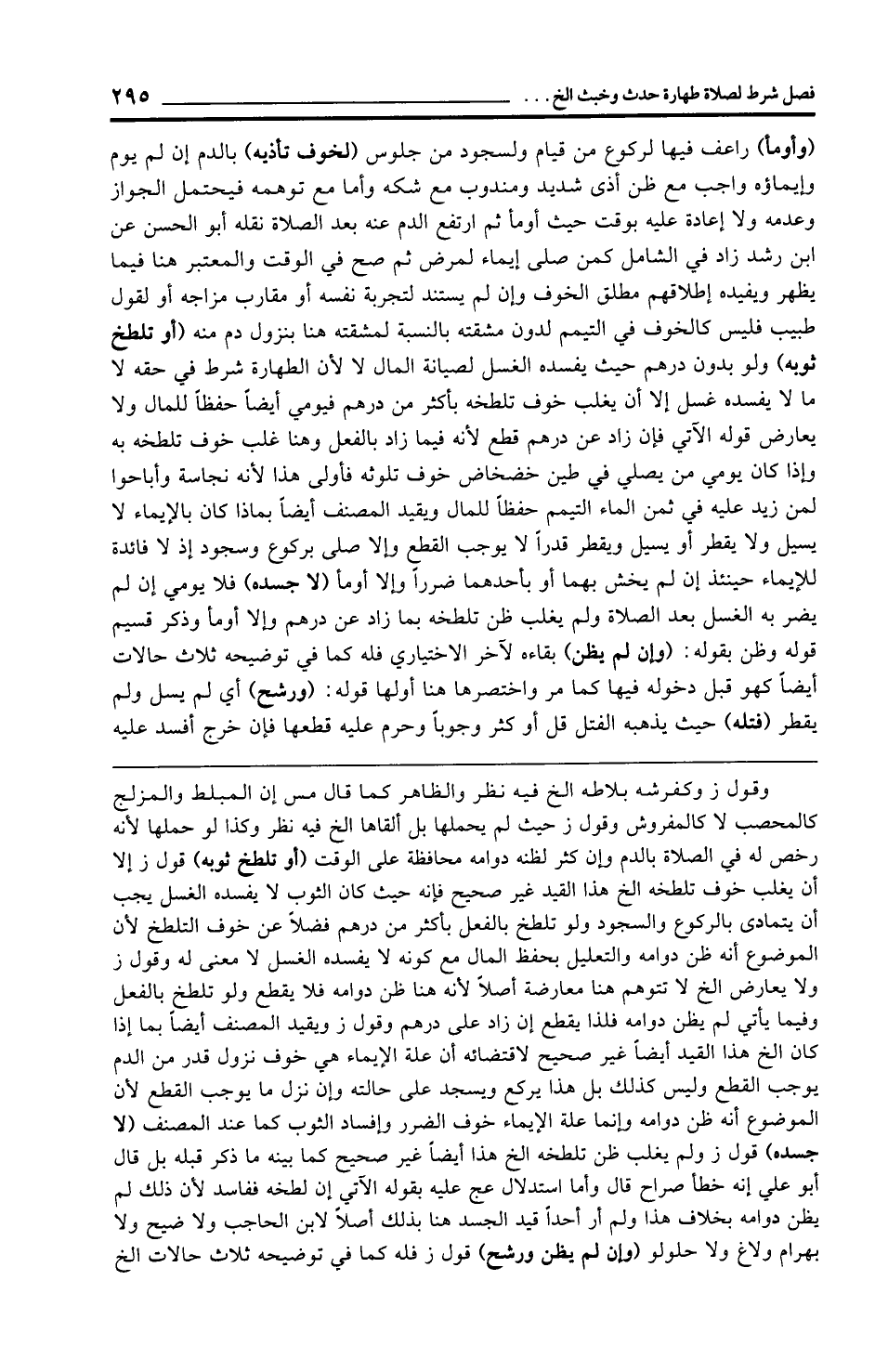 وقول ز وكفرشه بلاطه الخ فيه نظر والظاهر كما قال مس إن المبلط والمزلج كالمحصب لا كالمفروش وقول ز حيث لم يحملها بل ألقاها الخ فيه نظر وكذا لو حملها لأنه رخص له في الصلاة بالدم وإن كثر لظنه دوامه محافظة على الوقت (أو تلطخ ثوبه) قول ز إلا أن يغلب خوف تلطخه الخ هذا القيد غير صحيح فإنه حيث كان الثوب لا يفسده الغسل يجب أن يتمادى بالركوع والسجود ولو تلطخ بالفعل بأكثر من درهم فضلًا عن خوف التلطخ لأن الموضوع أنه ظن دوامه والتعليل بحفظ المال مع كونه لا يفسده الغسل لا معنى له وقول ز ولا يعارض الخ لا تتوهم هنا معارضة أصلًا لأنه هنا ظن دوامه فلا يقطع ولو تلطخ بالفعل وفيما يأتي لم يظن دوامه فلذا يقطع إن زاد على درهم وقول ز ويقيد المصنف أيضًا بما إذا كان الخ هذا القيد أيضًا غير صحيح لاقتضائه أن علة الإيماء هي خوف نزول قدر من الدم يوجب القطع وليس كذلك بل هذا يركع ويسجد على حالته وإن نزل ما يوجب القطع لأن الموضوع أنه ظن دوامه وإنما علة الإيماء خوف الضرر وإفساد الثوب كما عند المصنف (لا جسده) قول ز ولم يغلب ظن تلطخه الخ هذا أيضًا غير صحيح كما بينه ما ذكر قبله بل قال أبو علي إنه خطأ صراح قال وأما استدلال عج عليه بقوله الآتي إن لطخه ففاسد لأن ذلك لم يظن دوامه بخلاف هذا ولم أر أحدًا قيد الجسد هنا بذلك أصلًا لابن الحاجب ولا ضيح ولا بهرام ولاغ ولا حلولو (وإن لم يظن ورشح) قول ز فله كما في توضيحه ثلاث حالات الخ