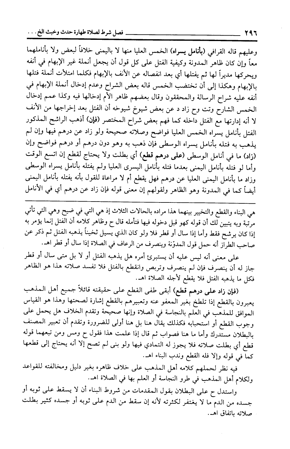 وعليهم قاله القرافي (بأنامل يسراه) الخمس العليا منها لا باليمنى خلافًا لبعض ولا بأناملهما معًا وإن كان ظاهر المدونة وكيفية الفتل على كل قول أن يجعل أنملة غير الإبهام في أنفه ويحركها مديرًا لها ثم يفتلها أي بعد انفصاله عن الأنف بالإبهام فكلما امتلأت أنملة فتلها بالإبهام وهكذا إلى أن تختضب الخمس قاله بعض الشراح وعدم إدخال أنملة الإبهام في أنفه عليه شراح الرسالة والمحققون وقال بعضهم ظاهر الأم إدخالها فيه وكذا عمم إدخال الخمس الشارح وتت وح زاد د عن بعض شيوخ شيوخه أن الفتل بعد إخراجها من الأنف لا أنه إدارتها مع الفتل داخله كما فهم بعض شراح المختصر (فإن) أذهب الراشح المذكور الفتل بأنامل يسراه الخمس العليا فواضح وصلاته صحيحة ولو زاد عن درهم فيها وإن لم يذهب به قتله بأنامل يسراه الوسطى فإن ذهب به وهو دون درهم أو درهم فواضح وإن (زاد) ما في أنامل الوسطى (على درهم قطع) أي بطلت ولا يحتاج لقطع إن اتسع الوقت وأما لو قتله بأنامل اليمنى بعدما فتله بأنامل اليسرى العليا ولم يفتله بأنامل يسراه الوسطى وزاد ما بأنامل اليمنى العليا عن درهم فهل يقطع أم لا مراعاة للقول بأنه يفتله بأنامل اليمنى أيضًا كما في المدونة وهو الظاهر ولقولهم إن معنى قوله فإن زاد عن درهم أي في الأنامل