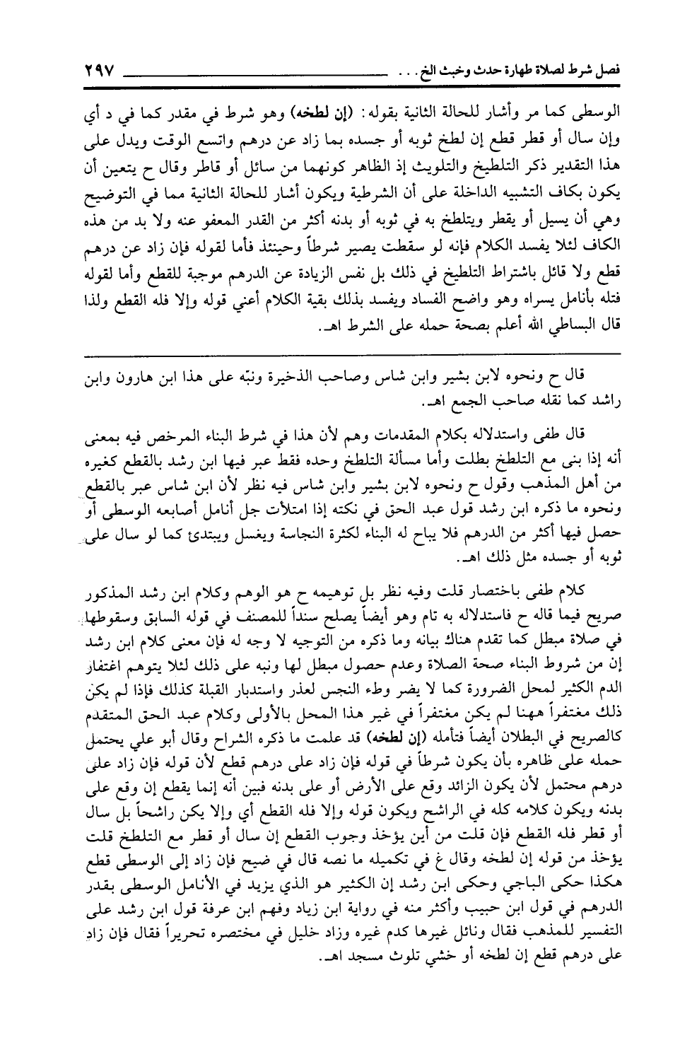 قال طفى واستدلاله بكلام المقدمات وهم لأن هذا في شرط البناء المرخص فيه بمعنى أنه إذا بنى مع التلطخ بطلت وأما مسألة التلطخ وحده فقط عبر فيها ابن رشد بالقطع كغيره من أهل المذهب وقول ح ونحوه لابن بشير وابن شاس فيه نظر لأن ابن شاس عبر بالقطع ونحوه ما ذكره ابن رشد قول عبد الحق في نكته إذا امتلأت جل أنامل أصابعه الوسطى أو حصل فيها أكثر من الدرهم فلا يباح له البناء لكثرة النجاسة ويغسل ويبتديء كما لو سال على ثوبه أو جسده مثل ذلك اهـ.