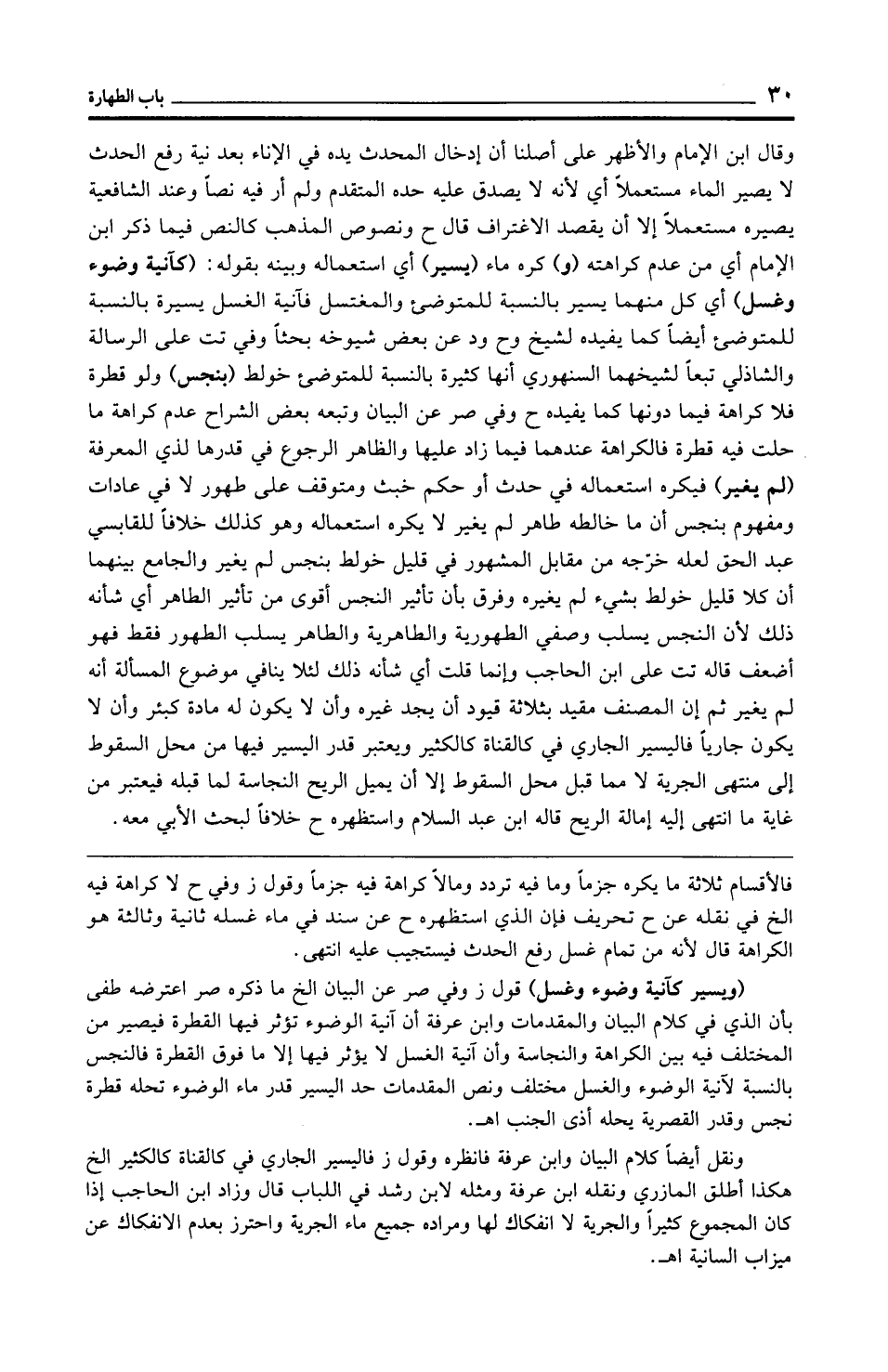 ونقل أيضًا كلام البيان وابن عرفة فانظره وقول ز فاليسير الجاري في كالقناة كالكثير الخ هكذا أطلق المازري ونقله ابن عرفة ومثله لابن رشد في اللباب قال وزاد ابن الحاجب إذا كان المجموع كثيرًا والجرية لا انفكاك لها ومراده جميع ماء الجرية واحترز بعدم الانفكاك عن ميزاب السانية اهـ.