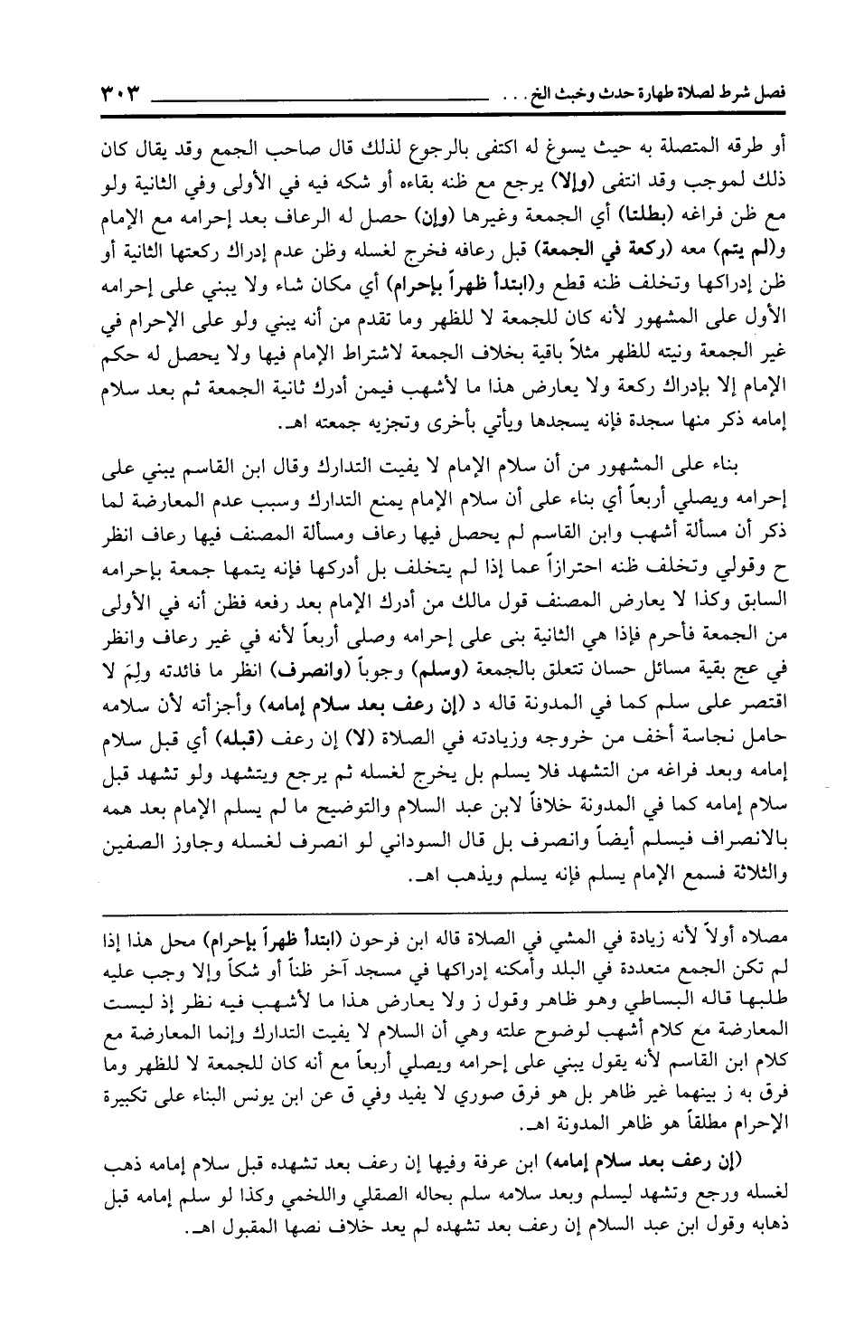بناء على المشهور من أن سلام الإمام لا يفيت التدارك وقال ابن القاسم يبني على إحرامه ويصلي أربعًا أي بناء على أن سلام الإمام يمنع التدارك وسبب عدم المعارضة لما ذكر أن مسألة أشهب وابن القاسم لم يحصل فيها رعاف ومسألة المصنف فيها رعاف انظر ح وقولي وتخلف ظنه احترازًا عما إذا لم يتخلف بل أدركها فإنه يتمها جمعة بإحرامه السابق وكذا لا يعارض المصنف قول مالك من أدرك الإمام بعد رفعه فظن أنه في الأولى من الجمعة فأحرم فإذا هي الثانية بنى على إحرامه وصلى أربعًا لأنه في غير رعاف وانظر في عج بقية مسائل حسان تتعلق بالجمعة (وسلم) وجوبًا (وانصرف) انظر ما فائدته ولِمَ لا اقتصر على سلم كما في المدونة قاله د (إن رعف بعد سلام إمامه) وأجزأته لأن سلامه حامل نجاسة أخف من خروجه وزيادته في الصلاة (لا) إن رعف (قبله) أي قبل سلام إمامه وبعد فراغه من التشهد فلا يسلم بل يخرج لغسله ثم يرجع ويتشهد ولو تشهد قبل سلام إمامه كما في المدونة خلافًا لابن عبد السلام والتوضيح ما لم يسلم الإمام بعد همه بالانصراف فيسلم أيضًا وانصرف بل قال السوداني لو انصرف لغسله وجاوز الصفين والثلاثة فسمع الإمام يسلم فإنه يسلم ويذهب اهـ.