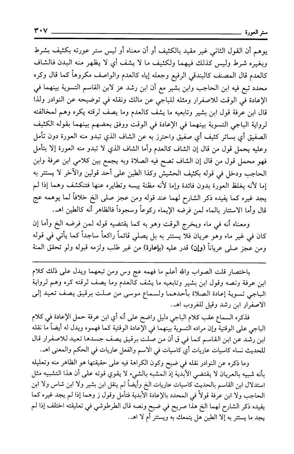 فذكره السماع عقب كلام الباجي دليل واضح على أنه أي ابن عرفة حمل الإعادة في كلام الباجي على الوقتية وإن مراده التسوية بينهما في الإعادة الوقتية كما فهموه ويدل له أيضًا ما نقله ابن رشد عن ابن القاسم كما في ق أن من صلت برقيق يصف جسدها تعيد للاصفرار قال للحديث نساء كاسيات عاريات أي كاسيات في الاسم والفعل عاريات في الحكم والمعنى اهـ.