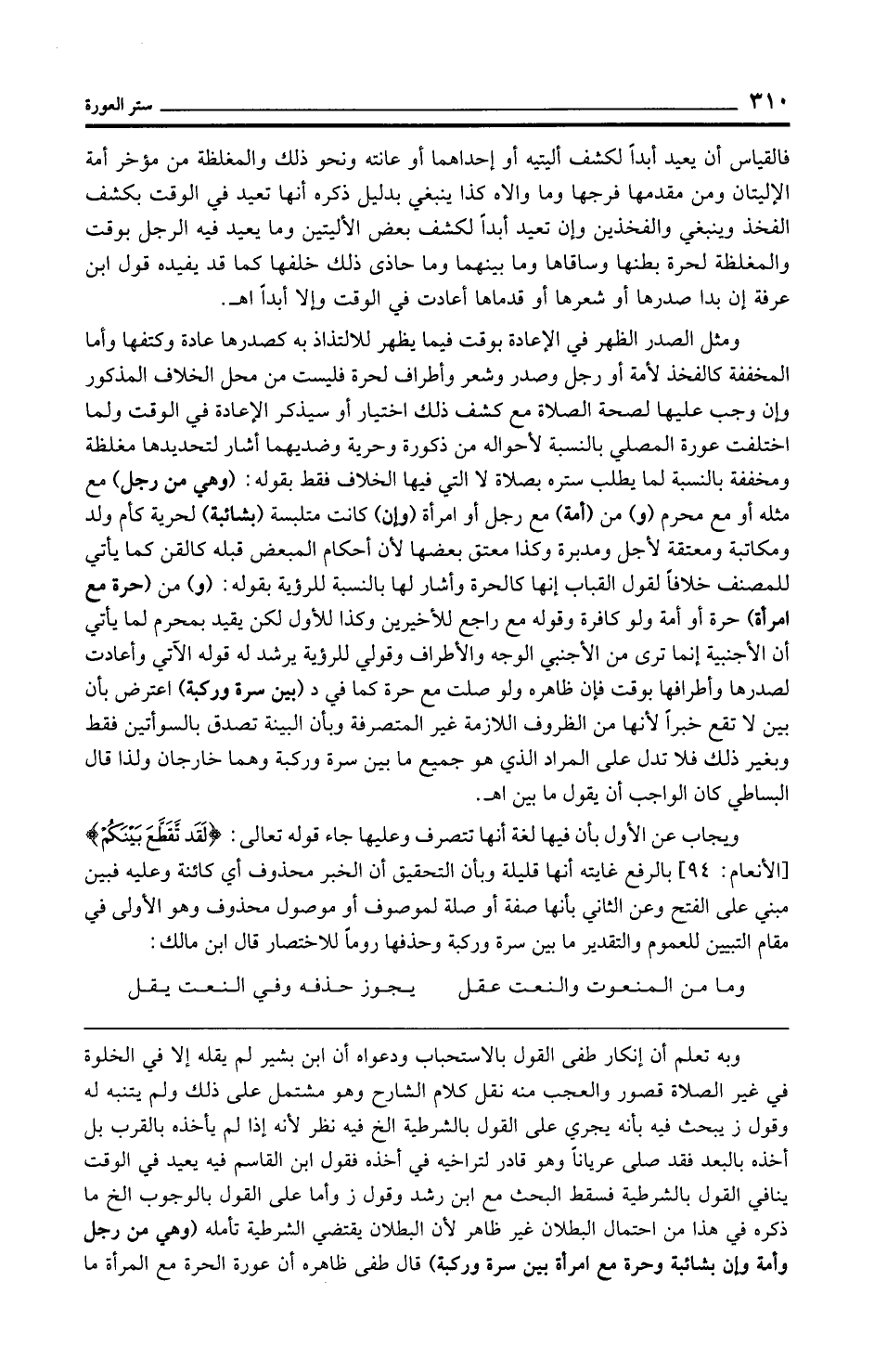 وبه تعلم أن إنكار طفى القول بالاستحباب ودعواه أن ابن بشير لم يقله إلا في الخلوة في غير الصلاة قصور والعجب منه نقل كلام الشارح وهو مشتمل على ذلك ولم يتنبه له وقول ز يبحث فيه بأنه يجري على القول بالشرطية الخ فيه نظر لأنه إذا لم يأخذه بالقرب بل أخذه بالبعد فقد صلى عريانًا وهو قادر لتراخيه في أخذه فقول ابن القاسم فيه يعيد في الوقت ينافي القول بالشرطية فسقط البحث مع ابن رشد وقول ز وأما على القول بالوجوب الخ ما ذكره في هذا من احتمال البطلان غير ظاهر لأن البطلان يقتضي الشرطية تأمله (وهي من رجل وأمة وإن بشائبة وحرة مع امرأة بين سرة وركبة) قال طفى ظاهره أن عورة الحرة مع المرأة ما