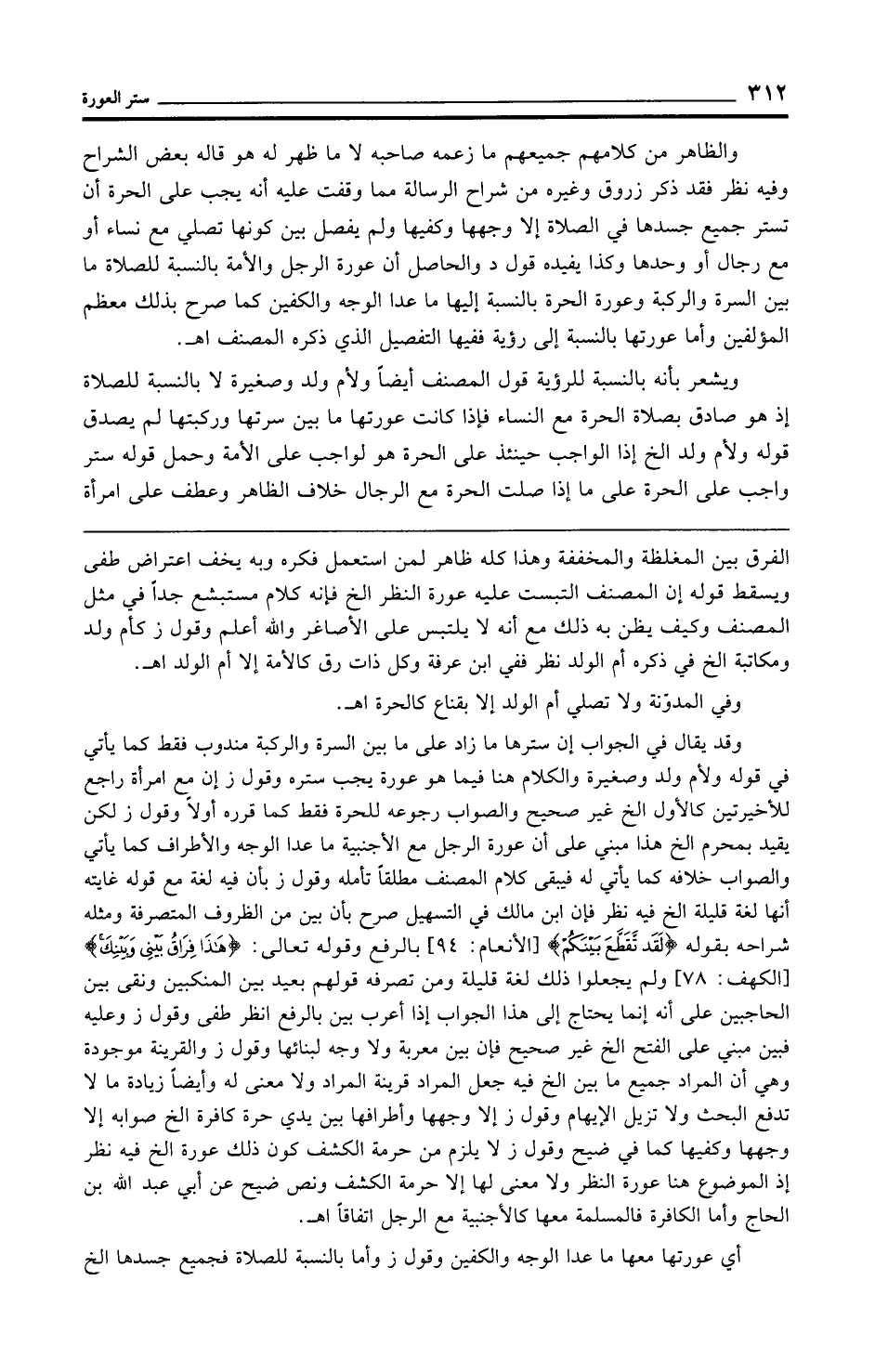 والظاهر من كلامهم جميعهم ما زعمه صاحبه لا ما ظهر له هو قاله بعض الشراح وفيه نظر فقد ذكر زروق وغيره من شراح الرسالة مما وقفت عليه أنه يجب على الحرة أن تستر جميع جسدها في الصلاة إلا وجهها وكفيها ولم يفصل بين كونها تصلي مع نساء أو مع رجال أو وحدها وكذا يفيده قول د والحاصل أن عورة الرجل والأمة بالنسبة للصلاة ما بين السرة والركبة وعورة الحرة بالنسبة إليها ما عدا الوجه والكفين كما صرح بذلك معظم المؤلفين وأما عورتها بالنسبة إلى رؤية ففيها التفصيل الذي ذكره المصنف اهـ.